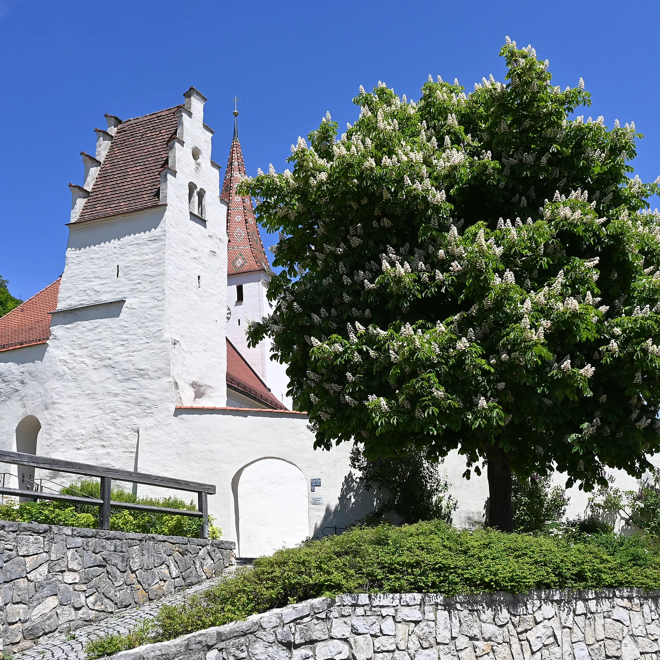 Eine ganz andere Art von Burg liegt in Kinding an der Strecke. Hier wurde die Kirche so befestigt, dass die Dorfbewohner im Notfall Schutz hinter ihren Mauern suchen konnten. Der wehrhafte Charakter der Kirchenburg ist noch gut zu erkennen. Sie ist die größte ihrer Art in der Diözese Eichstätt.