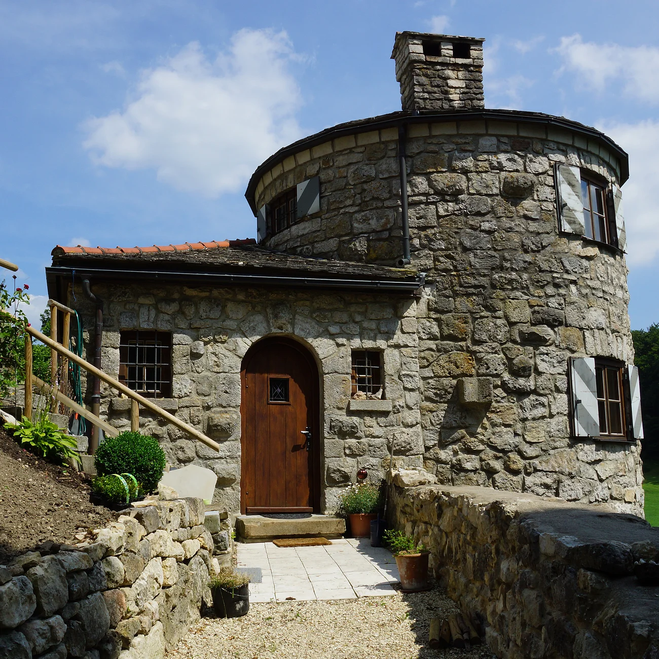 Ein Stück Mauer, ein Gewölbe: Von der Burg Mörnsheim sind nur Reste vorhanden. Wer von Mörnsheim Richtung Dollnstein wandert, kommt direkt daran vorbei. Besonders auffällig ist der hübsche runde Turm. Er wurde restauriert und beherbergt heute als Amalienturm eine Ferienwohnung.