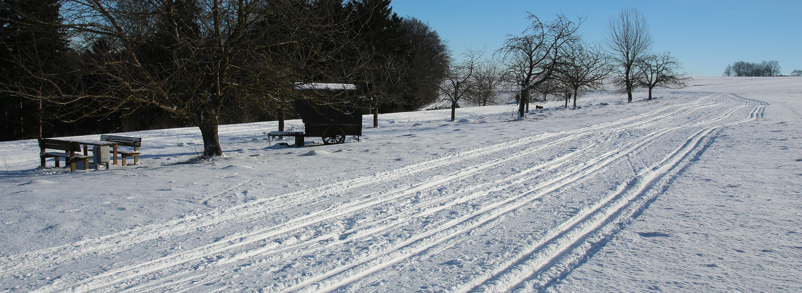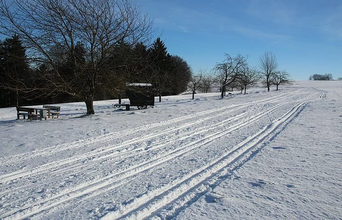 Die Loipe führt von dort durch die schöne Hochfläche des Zeltlagerplatzes mit ihren eindrucksvollen Bäumen. Nun geht es immer am Waldrand und am Albrand entlang (Links auf dem "Lohhof" stehen zwei Funktürme, die den höchsten Punkt (612 m) des Landkreises Roth markieren).