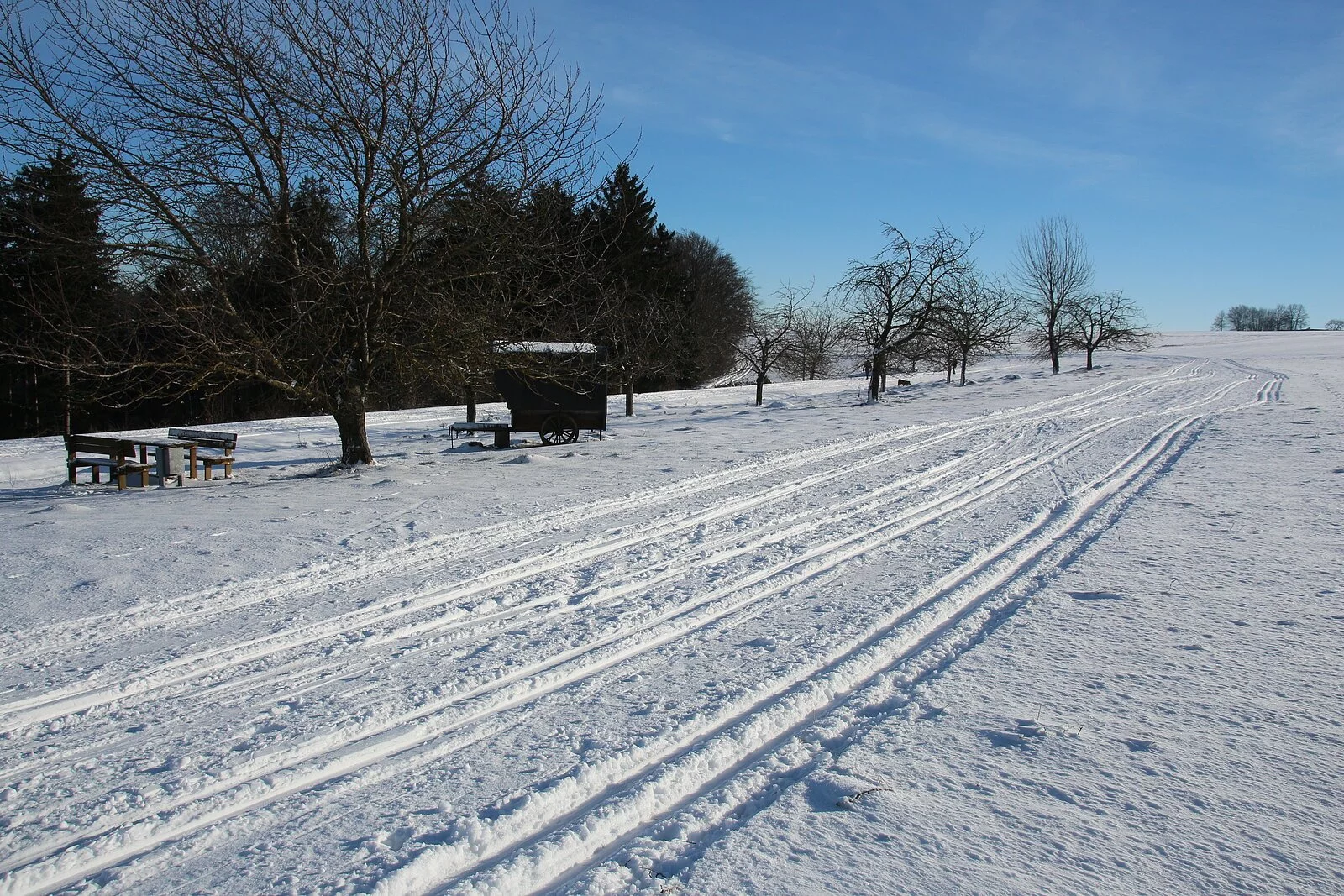 Bei besonders guter Wetterlage sind von hier aus die Alpen zu sehen. Auf der Hochfläche bleibend, mit herrlichen Blick ins Tal geht es zur Verbindungsstraße Funkturm - Ohlangen. Ein Stück weiter, bei der blauen Tafel „Wasserschutzgebiet“, biegen wir nach links ab und erreiche wieder den Wald. Nun können wir einen Abstecher in den Wald machen. Wir erreichen eine wunderschöne Lichtung, auf der wir die eine oder andere kleine Runde auf über 600 m über dem Meeresspiegel drehen können. Wieder zurück laufen wir am Waldrand entlang Richtung Dannhausener Flur. Hier gilt es Vorsicht walten zu lassen. Eine rasante Abfahrt, die mit einer scharfen Linkskurve endet bringt uns in Fahrt und bei eisigen Verhältnissen auch zu Fall. Aber danach laufen wir wieder stetig auf die Hochfläche zurück. Vorbei an einer Hecke. Der Blick fällt wieder zum Lohhof mit seinen großen Funktürmen. Bald schon sind wir wieder zurück auf dem Rundkurs.