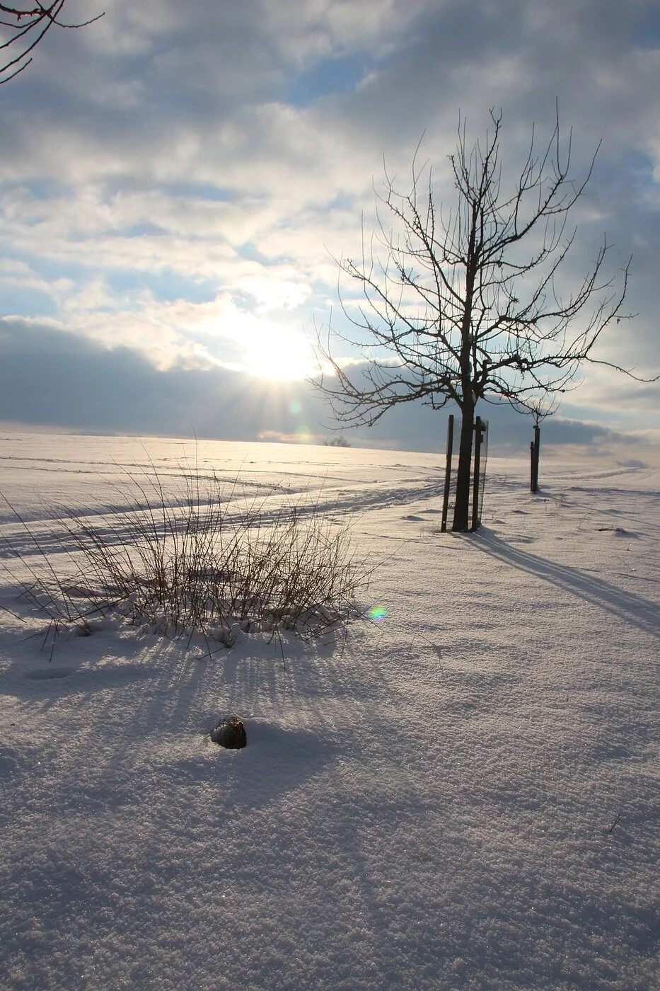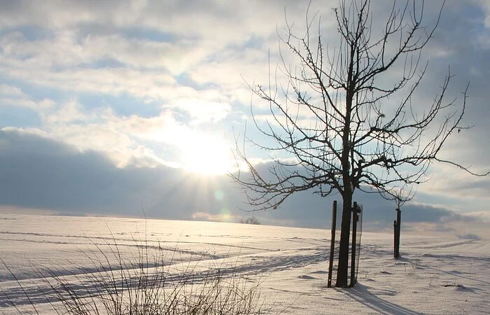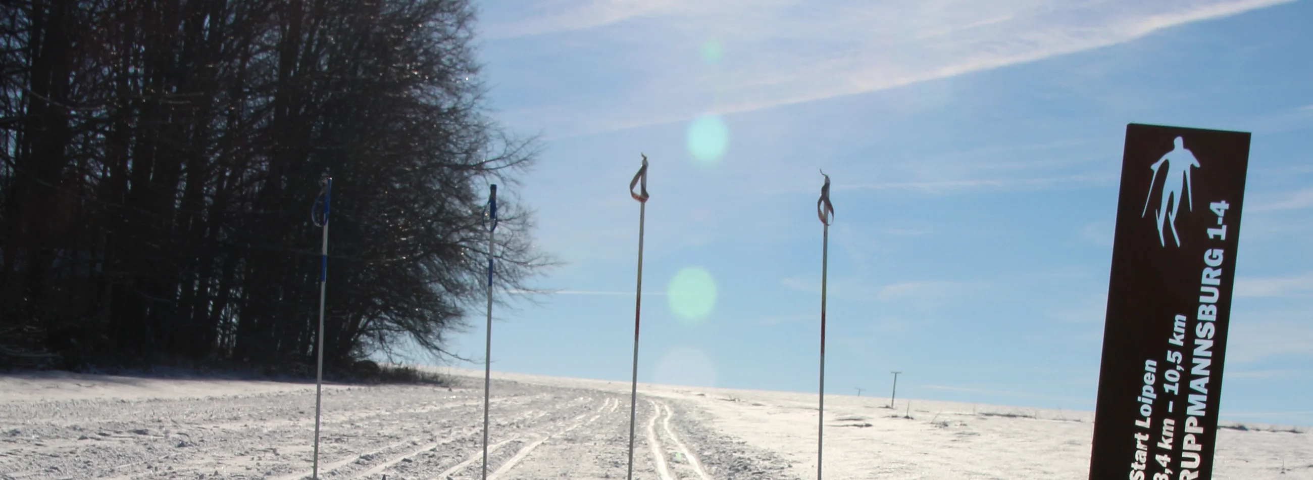Weiter geht es an der westlichen Seite des Espans zum Loipenbeginn zurück. Die markante Lindenallee begleitet uns nun linkerhand. Ein Blick nach rechts durch die Winterbäume lässt uns den Ort Alfershausen erkennen. Bei Sonnenschein glitzern die Gräser des Espans und auch eine Bank lädt nochmals zu einer Pause ein. Das letzte Stück geht über den Pferchplatz oder am Pferchplatz des Schäfers vorbei. Am Ende der Skating-Loipe entscheiden wir uns für eine weitere Runde (vielleicht linksherum) oder für den Rückweg durch den Wald zu unserer Ausgangsstation.