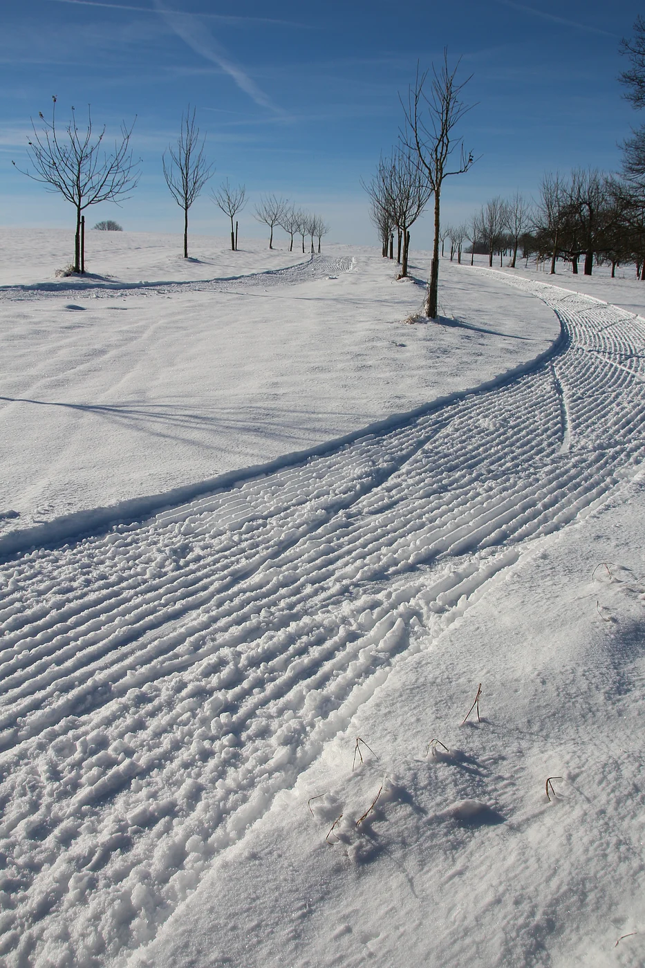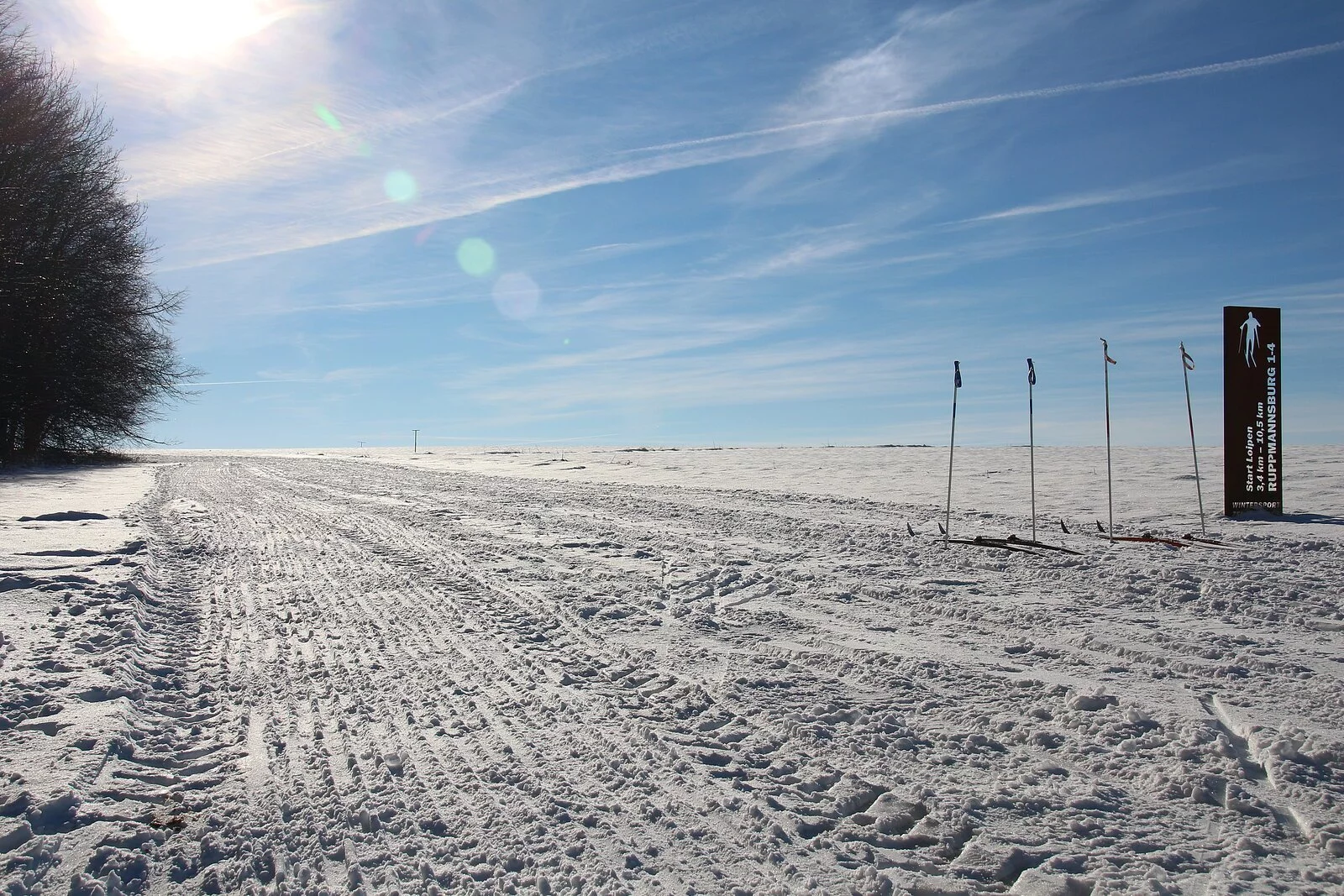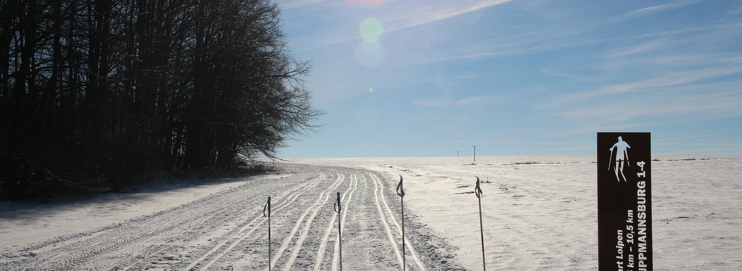 Hier befindet sich die große Loipenkreuzung, an der sich alle Loipen treffen. Von hier aus starten wir links in die Loipe 2 mit 6,2 km. Nach einer kurzen freien Strecke gleiten wir an einer Hecke vorbei, die am Ende einen Blick auf die schöne Jura-Hochfläche freigibt. Nach einer flachen Abfahrt vorbei an einzelnen Bäumen treffen wir auf einen Weg, an dem wir wieder rechts abbiegen. Diese Loipe führt uns über Reichersdorf und an einem eindrucksvollen Lindenbaum vorbei, wieder zur Loipenkreuzung zurück.