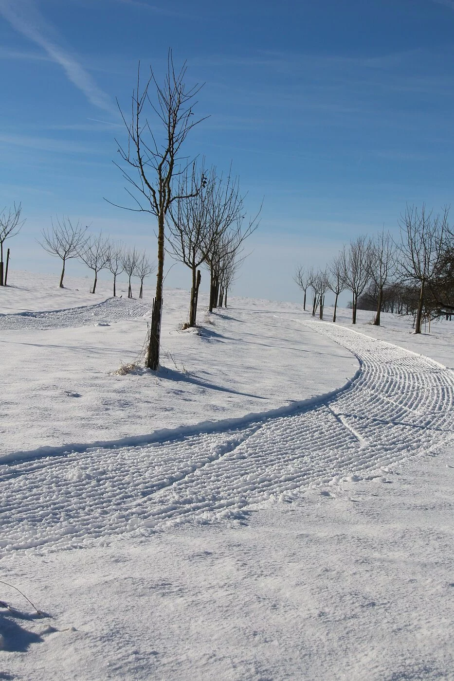 Wir folgenden der Loipe 2 und bleiben auf dieser in Richtung Süden. Es geht nun sanft aufwärts vorbei an einer weiteren einzeln stehenden Baumgruppe. Über die freie Hochfläche gleiten wir mit nur kleinen Richtungsänderungen südwärts dahin. Unglaublich weites Land tut sich auf. Da und dort sehen wir Rehrudel oder nur ihre Spuren im Schnee. Die Funktürme grüßen uns und zeigen uns die Grenze des Landkreises Roth an. Bald schon sind wir an der südöstlichen Spitze der Loipe. Wir schwenken nach rechts ab und sehen bald die eng beieinanderliegenden Ortschaften Stadelhofen und Biburg. Beide Orte trennt die Landkreis- und die Bezirksgrenze. Nach kurzer Strecke schwenken wir abermals rechts ab. Bis hierher ist die Loipe identisch mit der großen Loipe 4.