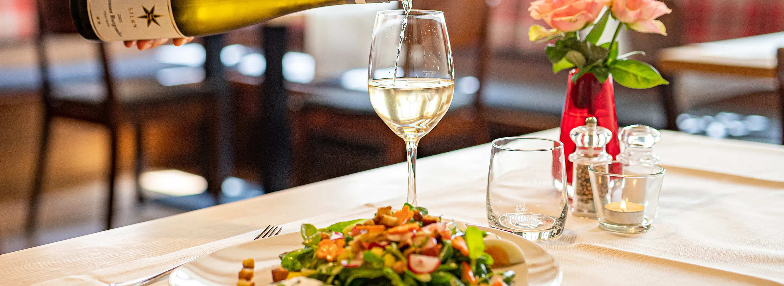 Das Highlight des Arrangements bildet unser Stern-Menü am zweiten Abend, ein romantisches 4-Gang Menü ganz nach dem Slow Food Motto von unserem Küchenchef Silvester Meyer kreiert. Begleitet wird das Menü von den vielfach ausgezeichneten Weinen des Weingut Stern aus der Pfalz. Ursprünglich über eine Freundschaft der beiden Großväter zusammengekommen, beliefern uns seit mehr als 30 Jahren Wolfgang (Vater) und Dominic (Sohn, jetziger Winzer) mehrmals im Jahr höchstpersönlich.