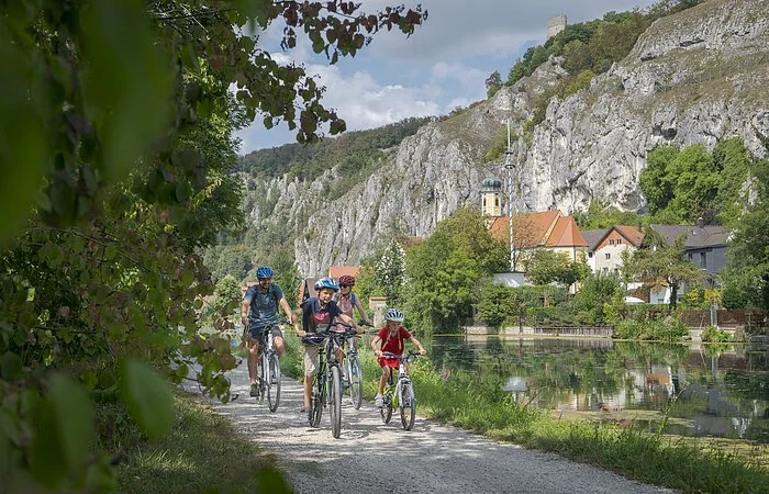 Ihre Tour starten Sie in der Wittelsbacher-Stadt Kelheim, die Sie mit der imposanten Befreiungshalle auf dem Michelsberg willkommen heißt. Ihr Weg führt Sie zunächst flussaufwärts entlang des Main-Donau-Kanals ins untere Altmühltal zu den idyllischen Örtchen Essing mit der Burgruine Randeck und Prunn mit der gleichnamigen Burg. Wenn Sie Ihr E-Bike bereits hier einem Bergtest unterziehen möchten, lohnt sich ein Abstecher zu den Burgen, die hoch über dem Altmühltal thronen. Ansonsten lohnt sich auch ein Ausflug zur Tropfsteinhöhle Schulerloch, deren faszinierende unterirdische Welt Kinder und Erwachsene staunen lässt.