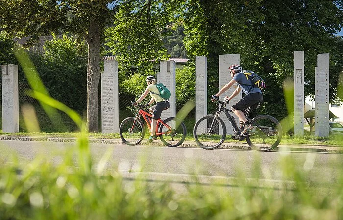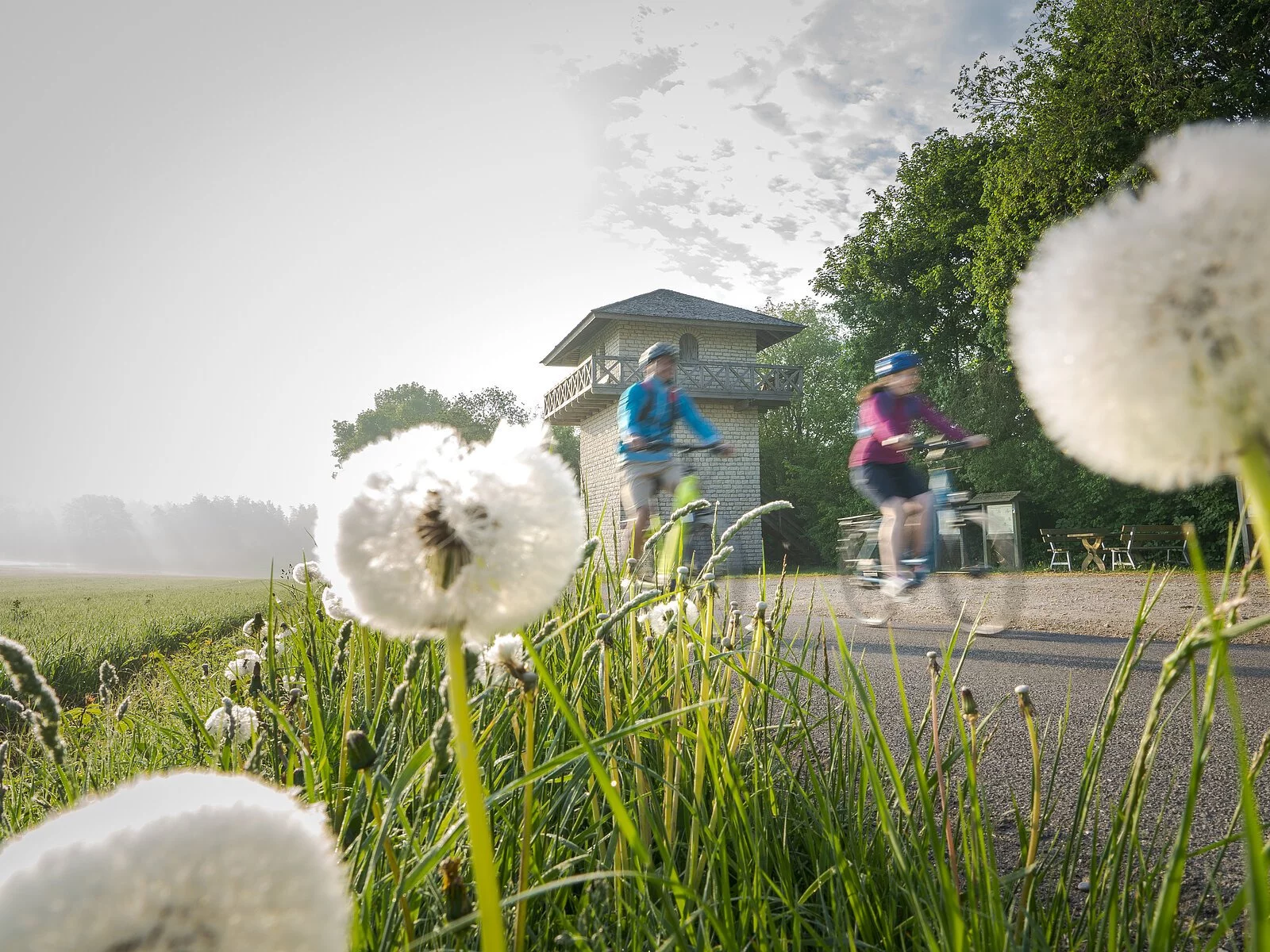 Zwei Radfahrer, eine Frau und ein Mann, fahren  den Limesturm vorbei. Beide tragen einen Fahrradhelm. Im Vordergrund sind einige Pusteblumen im Gras zu sehen. Der Himmel ist bewölkt.