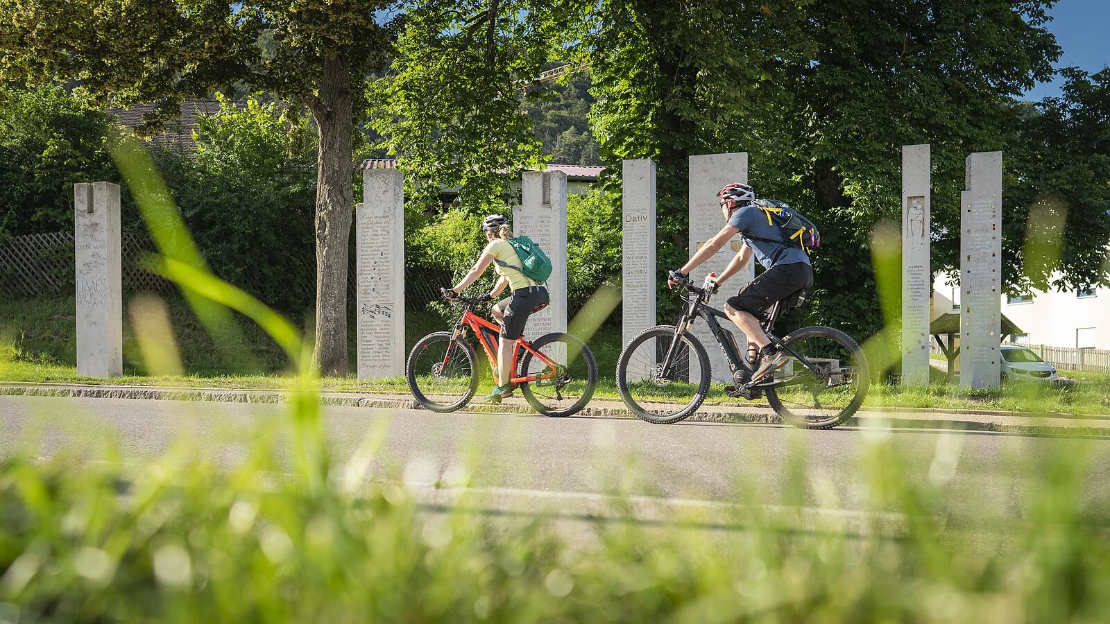 Zwei Radfahrer mit Helm sitzen auf Steinbank im Wald neben zwei Mountainbikes und drei Fahnen.KUNSTamBANDamLIMES bei KipfenbergHolzturm neben einem Waldweg mit zwei Radfahrern, umgeben von dichtem grünem Laubwald.