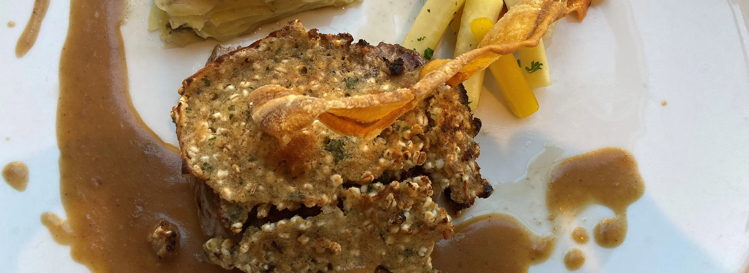 Zartes Filetsteak vom Altmühltaler Weiderind in aromatischer Haselnusskruste mit cremigem Kartoffelgratin – fein, nussig und perfekt abgestimmt mit einer samtigen Rotweinsauce.