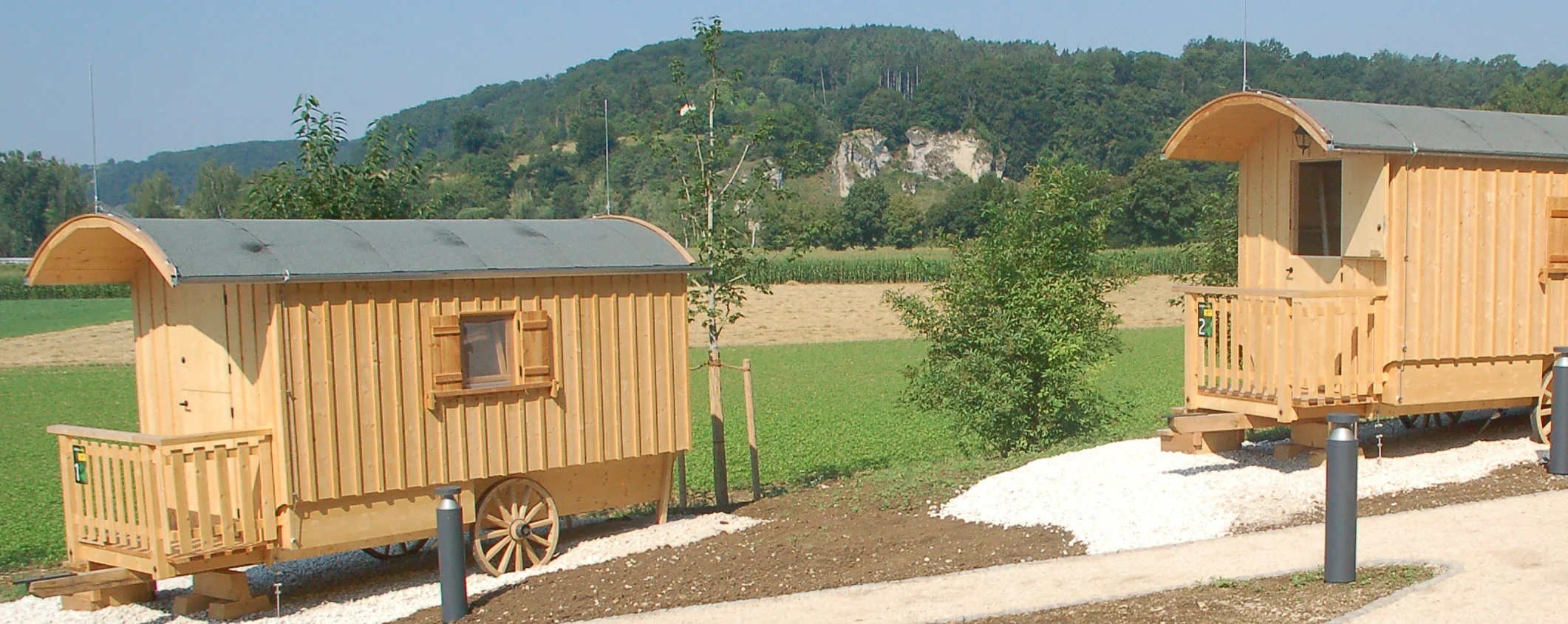 Gefertigt aus heimischem Holz – Fichte, Eiche und Lärche – und vielen weiteren natürlichen Materialien bieten sie zwei Erwachsenen mit zwei Kindern oder drei Erwachsenen Platz. Die Wägen sind komfortabel mit Kühlschrank, Steckdosen und einer kleinen Heizung für kühlere Nächte ausgestattet. Für die Verpflegung sorgt der Zeltplatz-Kiosk mit Biergarten.