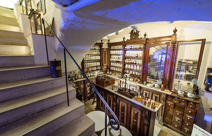 In der „Historischen Material- und Kräuterkammer“, strömt aus Schränken der Geruch von getrockneten Heilkräutern und Gewürzen. Mineralien, Harze, Kräuterhackbrett, Häckselmaschine, Mörser u. a. zeigen die Verarbeitung der Heilpflanzen. Ein besonders wertvolles Stück stellt das Manual (Rezeptbündel) aus dem späten 19. Jh. dar, in dem unterschiedlichste Rezepturen zusammengefasst sind. Daneben gibt es Erläuterungen zum berühmten Einhornpulver, das angeblich gegen jede Krankheit half.