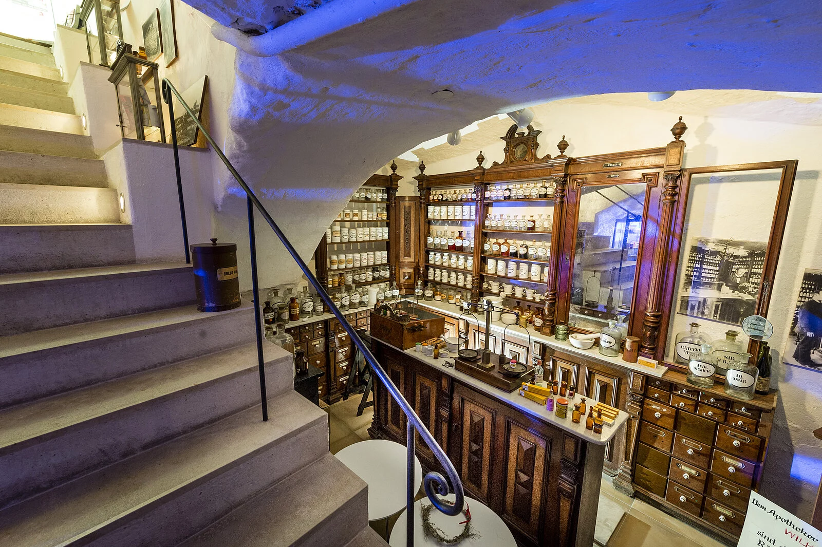 Die Einhorn-Apotheke kann auf eine über 350-jährige Tradition zurückblicken. Während im Erdgeschoss des „Blauen Hauses“, eines spätbarocken Gebäudes, heute noch die moderne Apotheke betrieben wird, kann man im darunter gelegenen früheren Arzneikeller die vollständige Apothekeneinrichtung aus der Zeit des berühmten Apothekers und Limesforschers Wilhelm Kohl (1848–1898) besichtigen. Neben der Offizin (Verkaufsraum der Apotheke) ist das Laboratorium mit sämtlichen damaligen Arbeitsgeräten wie Destillierkolben, Tubenabfüllgerät, Tablettenpressmaschine und vielem mehr erhalten.