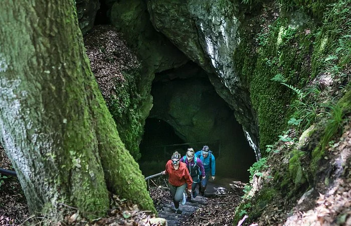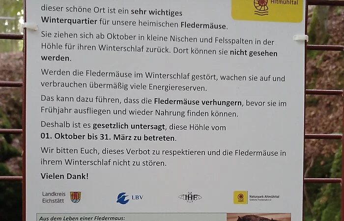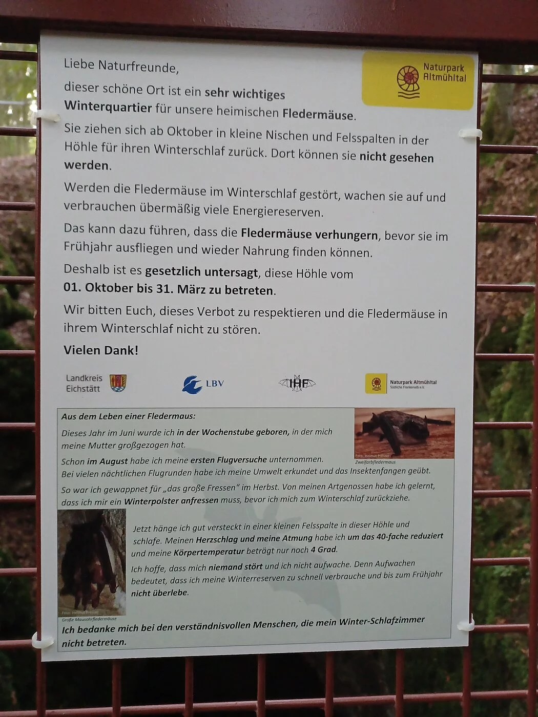 Höhlen sind übrigens keineswegs nur Todesgrüfte, in ihnen regt sich auch heute noch manches Leben. Sie sind wichtige Überwinterungsplätze für mehrere Fledermausarten (z. B. Mausohr, Langohr, Hufeisennase), die in ihrem Bestand stark gefährdet sind.