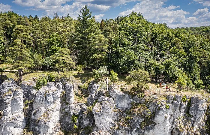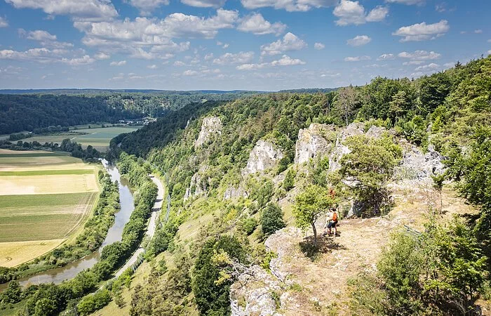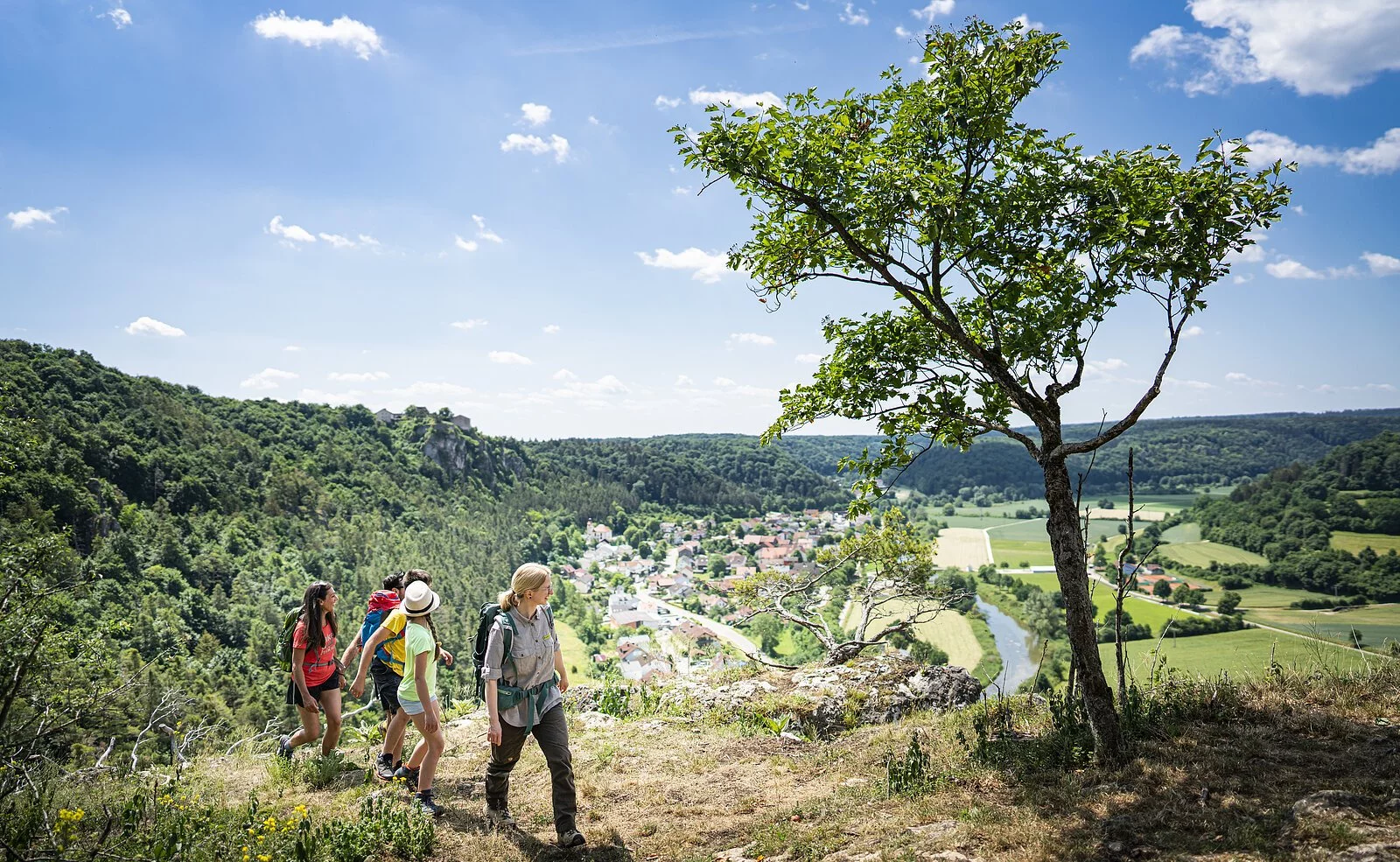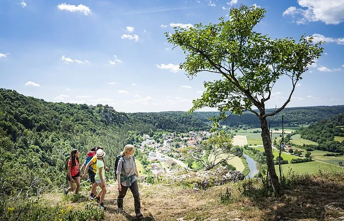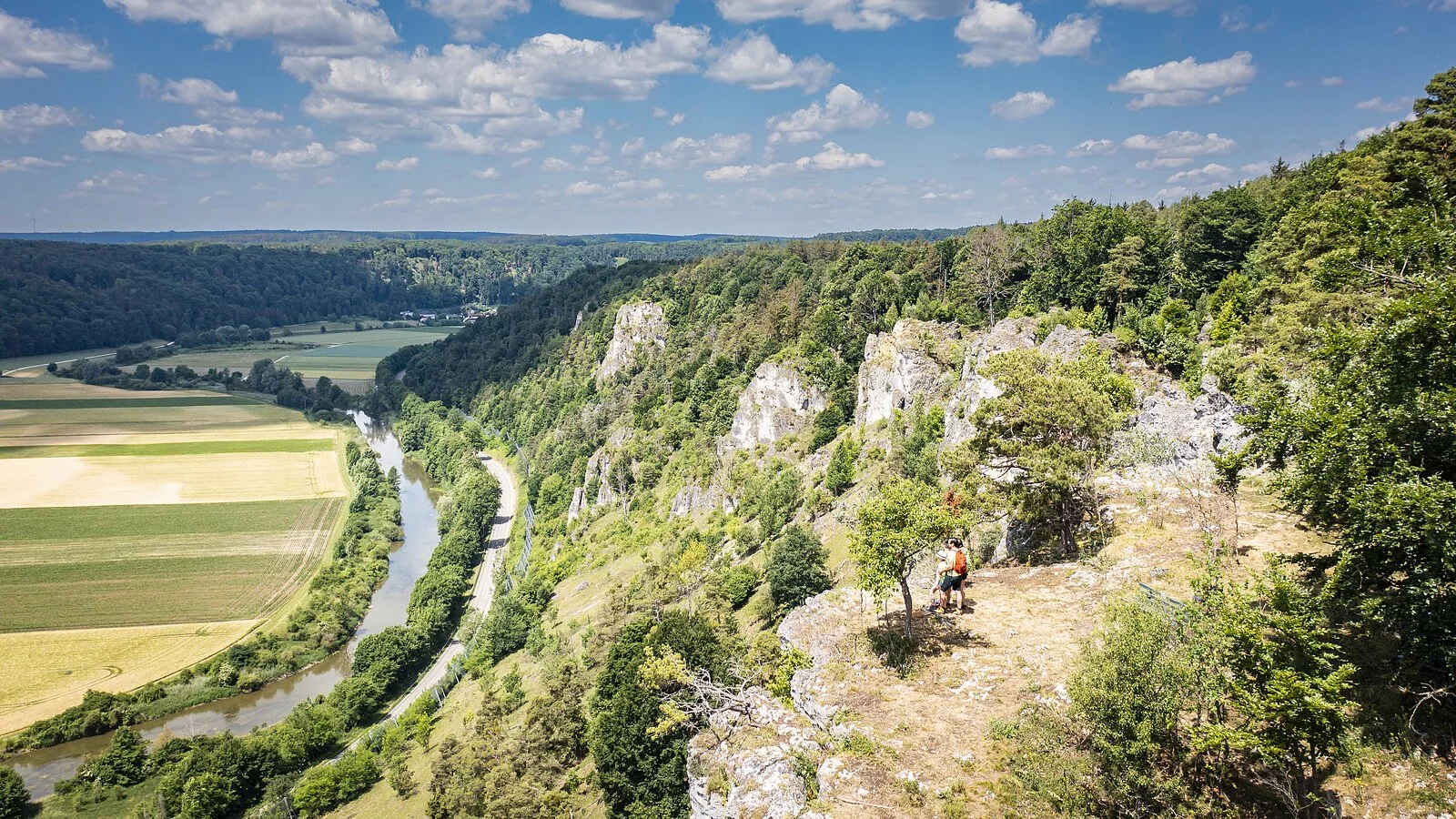 Landschaft mit grünen Feldern, einem Fluss und bewaldeten Hügeln unter einem bewölkten Himmel.Familie mit Rangerin auf der sommerlichen Arnsberger Leite mit Talblick im Hinergrund. Sommerlicher Blick ins Altmühltal auf das Tal, auf den Fluss und auf die Felsenkette Arnsberger Leite, auf der ganz klein am Talrand eine Familile steht und ins Tal schaut.Arnsberger LeiteFrontaler Blick auf eine Felspartie der Arnberger Leite auf der eine Familie steht. Im Hintergrund grüner, sommerlicher Wald und blauer Himmel mit weißen Wolken.