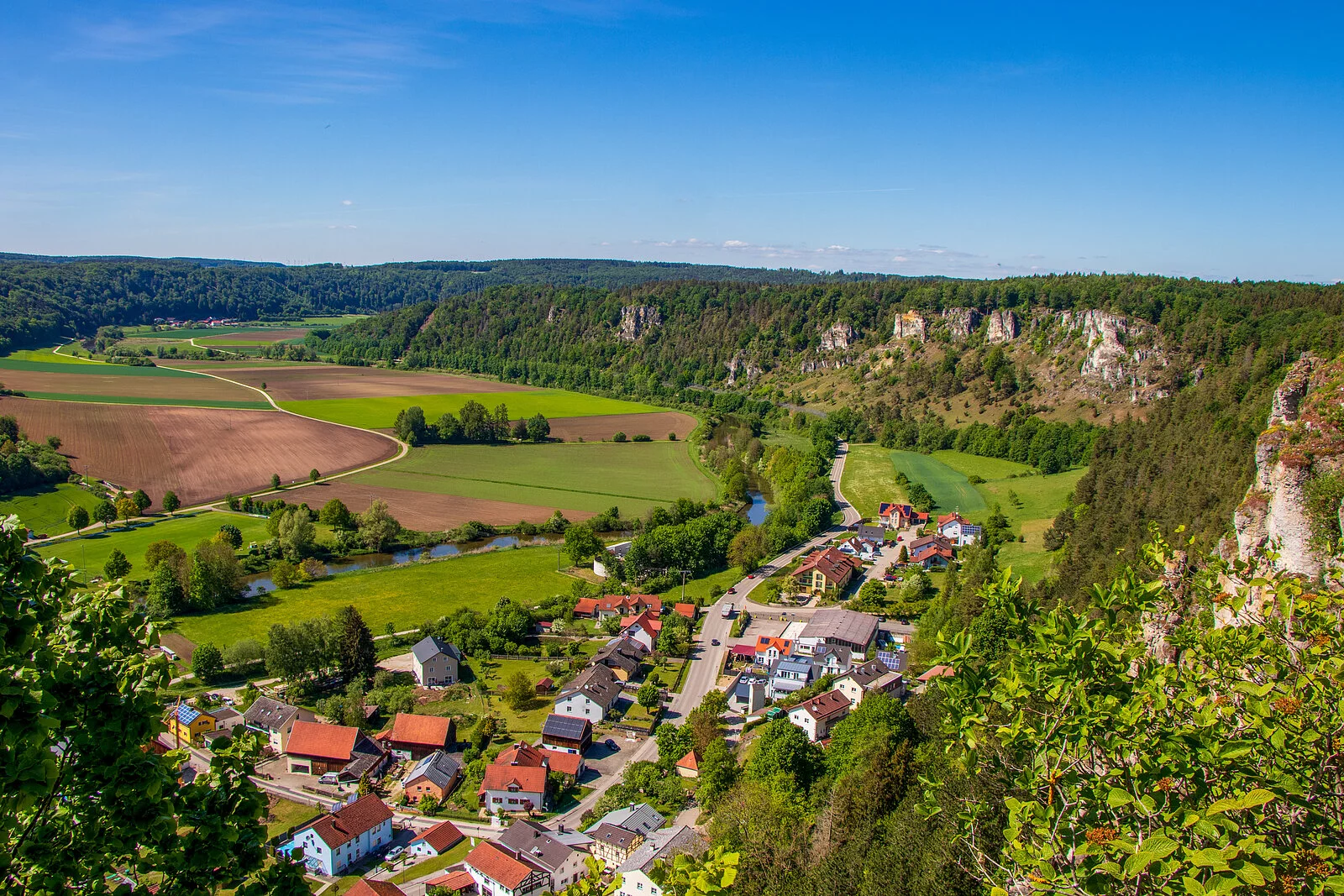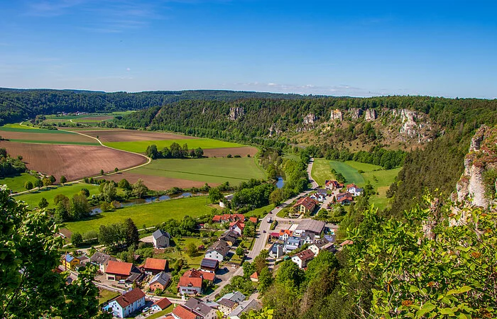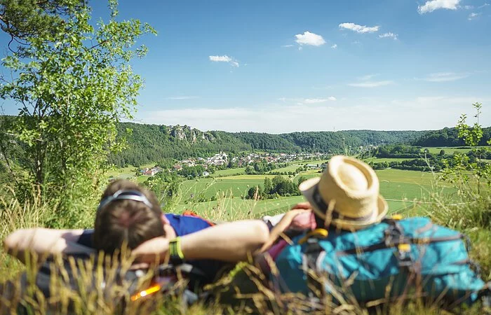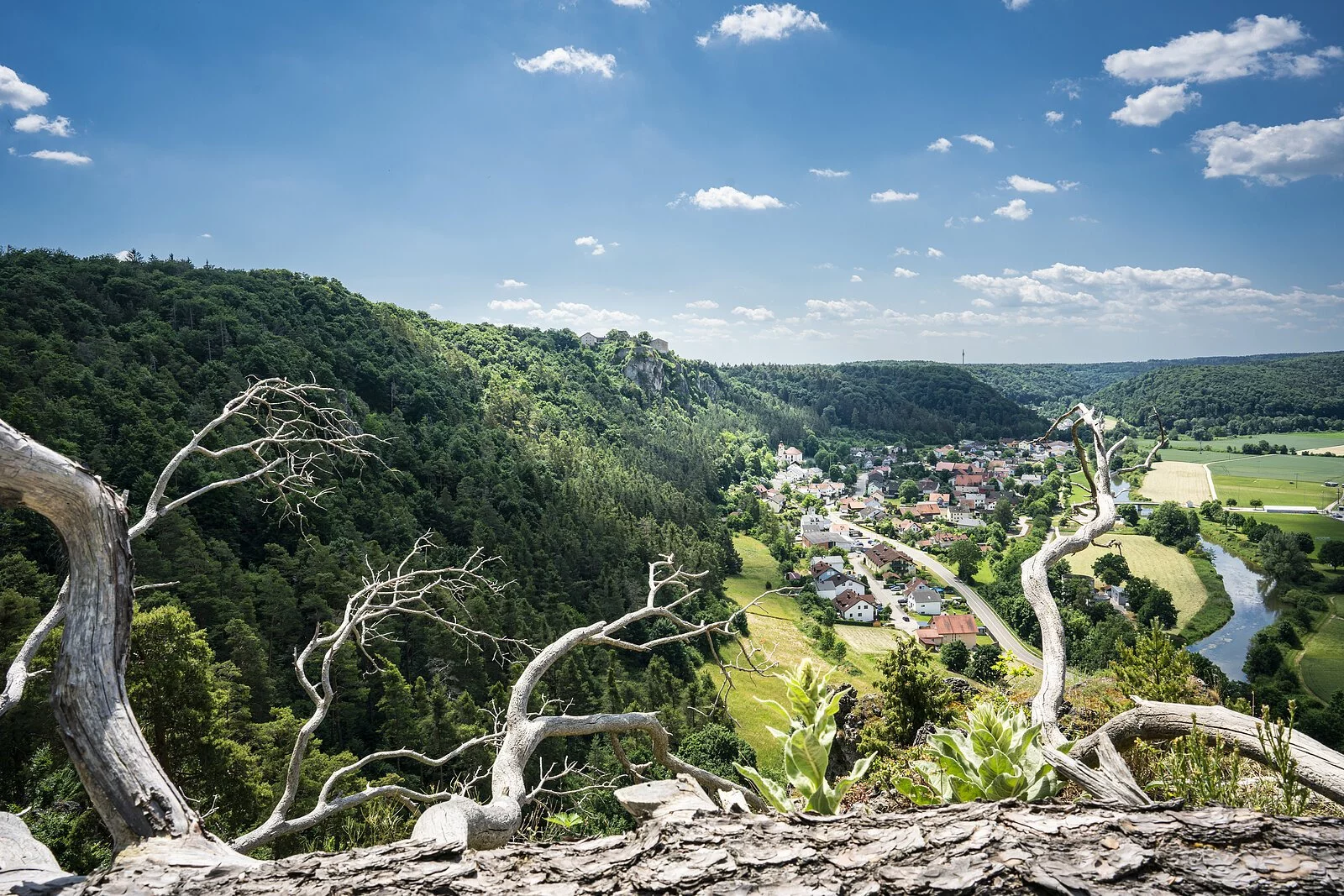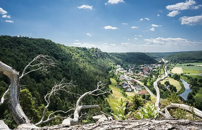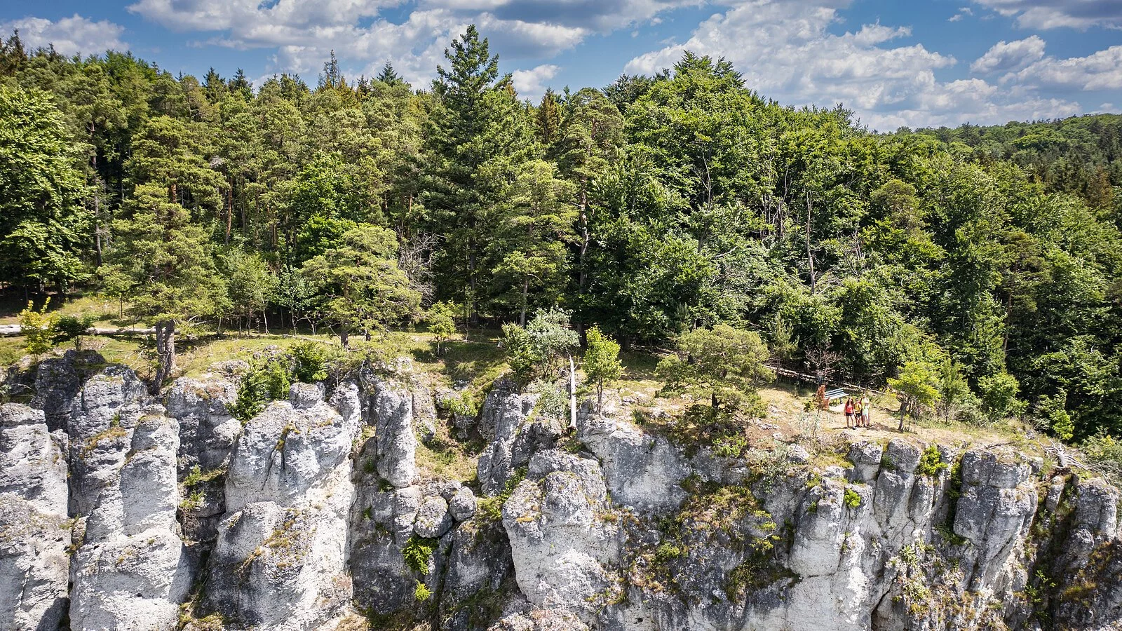 Landschaft mit grünen Feldern, einem Fluss und bewaldeten Hügeln unter einem bewölkten Himmel.Familie mit Rangerin auf der sommerlichen Arnsberger Leite mit Talblick im Hinergrund. Sommerlicher Blick ins Altmühltal auf das Tal, auf den Fluss und auf die Felsenkette Arnsberger Leite, auf der ganz klein am Talrand eine Familile steht und ins Tal schaut.Arnsberger LeiteFrontaler Blick auf eine Felspartie der Arnberger Leite auf der eine Familie steht. Im Hintergrund grüner, sommerlicher Wald und blauer Himmel mit weißen Wolken.