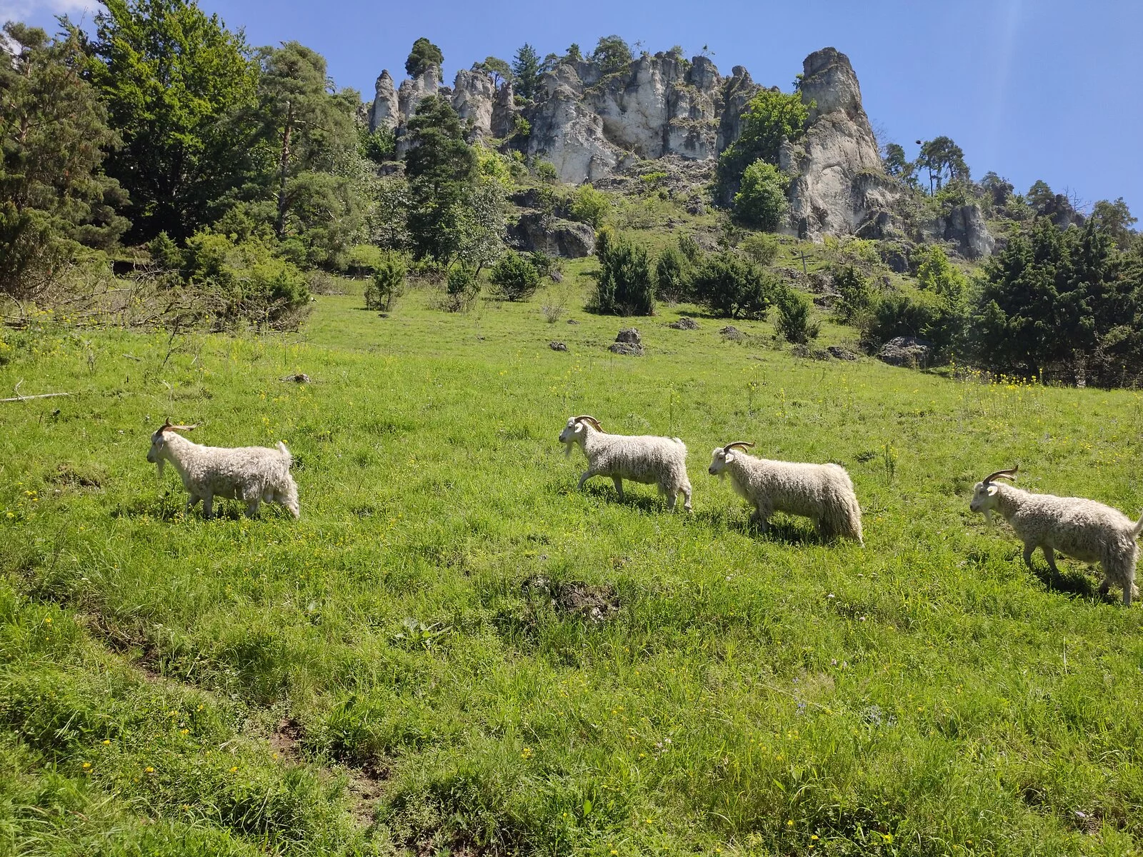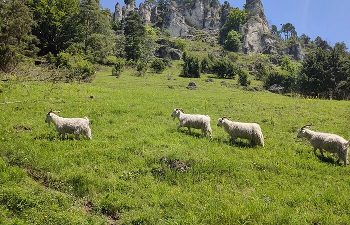 Mit etwas Glück trifft man auf eine Angoraziege aus der Herde, die im Rahmen des Projektes "Extensive Ganzjahresbeweidung der Arnsberger Leite“ einen großen Teil des Steil- und Felsenhangs beweidet. Für die Wanderer auf dem Altmühltal-Panoramaweg, der mitten durch die Leite führt, gibt es selbstschließende Tore (Einhegung des Hangs durch Elektrozäune).