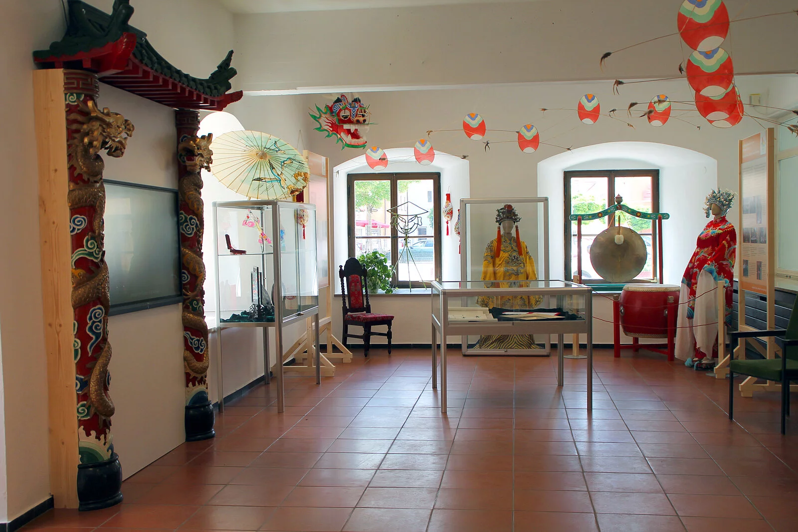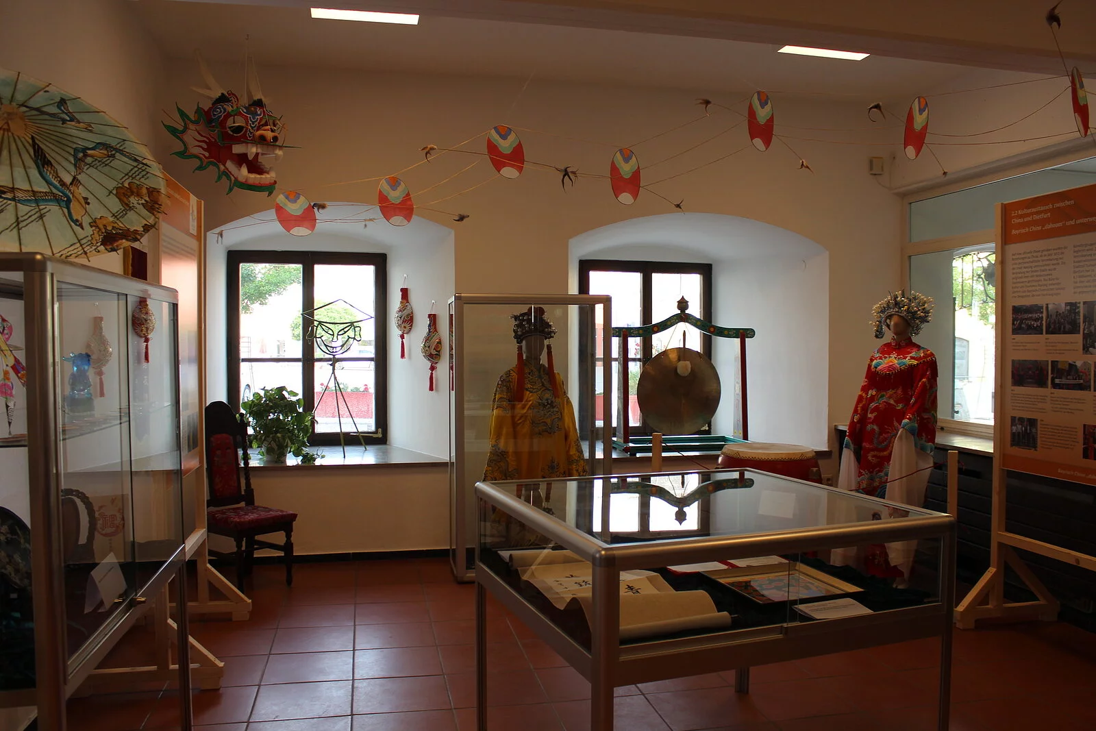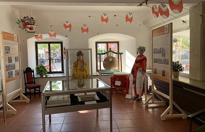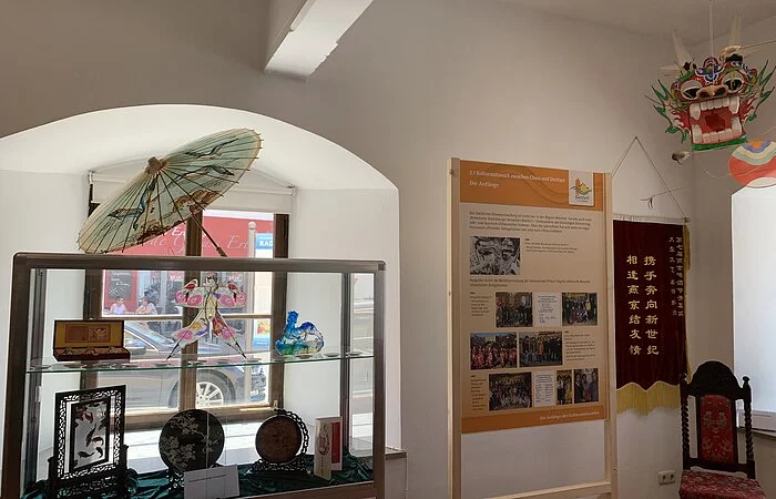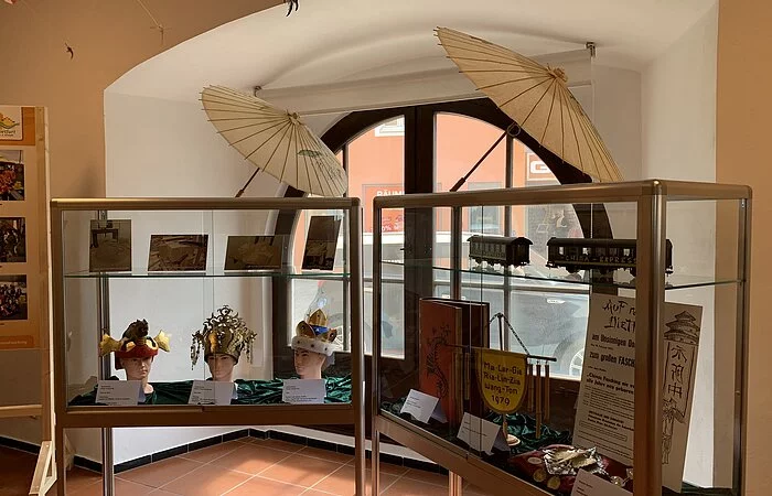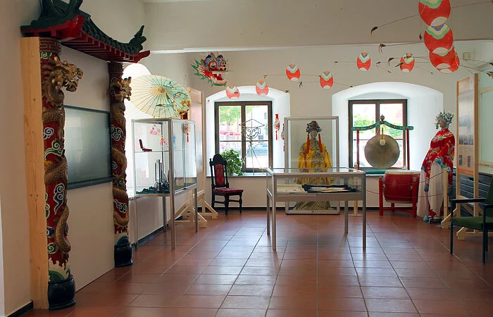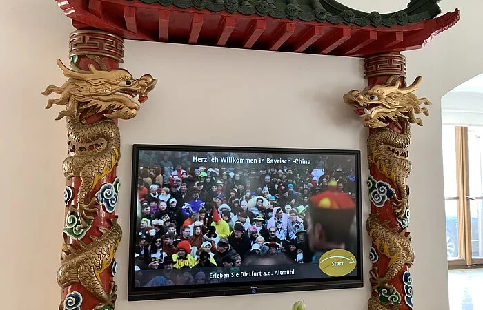 Die Ausstellung wurde im Juli 2020 neu gestaltet. Sie finden darin Ausstellungsstücke wie Kaisergewänder ehemaliger Kaiser und deren Kronen, Faschingskostüme vom Chinesenfasching, Historische und zeitgenössische Einblicke in das bunte Faschingstreiben am Unsinnigen Donnerstag. Ebenfalls können Sie dort die Beziehung zwischen Dietfurt und China erleben. Seit 1982 existiert freundschaftlicher Kulturaustausch mit dem Reich der Mitte. Was zuerst als Inspiration für den Fasching gedacht war hat sich in einem bilateralen Austausch von Kulturgruppen zwischen Dietfurt und dem Kulturbüro Nanjing entwickelt. Seit 2011 pflegt man hier jährlichen Austausch. Erhaltene Geschenke wie Kunstgegenstände oder auch traditionelle Gewänder aus China können Sie in diesem Teil der Ausstellung bewundern. Am Touch-Screen können Sie in die Vergangenheit eintauchen: Hier finden sich zukünftig Fotos, Videos und Berichte von den vergangenen Veranstaltungen und Ereignissen rund um Bayrisch China.