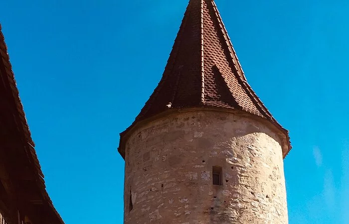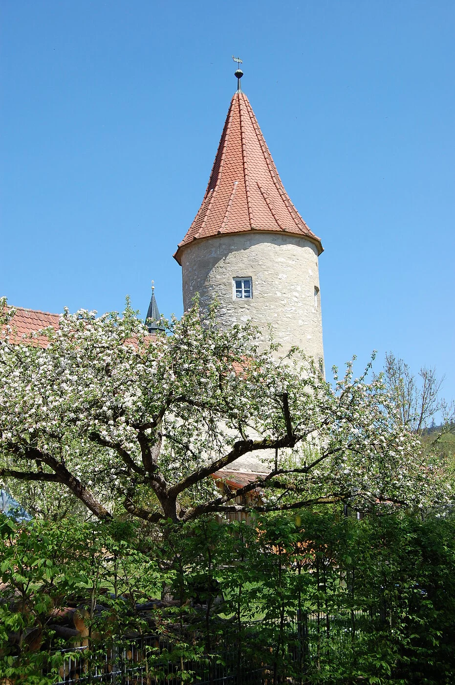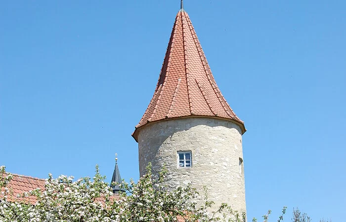 Der kreisrunde, zweigeschössige Turm im Südosten der Wehranlage, wurde nach 1450 erbaut und wird auch als oberer Teil des Storchenturms bezeichnet. Weitaus geläufiger ist jedoch der Name "Badturm", der an eine ehemalige Badstube erinnert, die sich ursprünglich in unmittelbarer Nähe des Turmes befunden hat. Die Hygiene seiner Bürger war dem Magistrat vor 500 Jahren gleichwohl öffentliches Anliegen: Brautpaare mussten vor ihrer Eheschließung ein Reinigungsbad in der öffentlichen Badstube nachweisen.