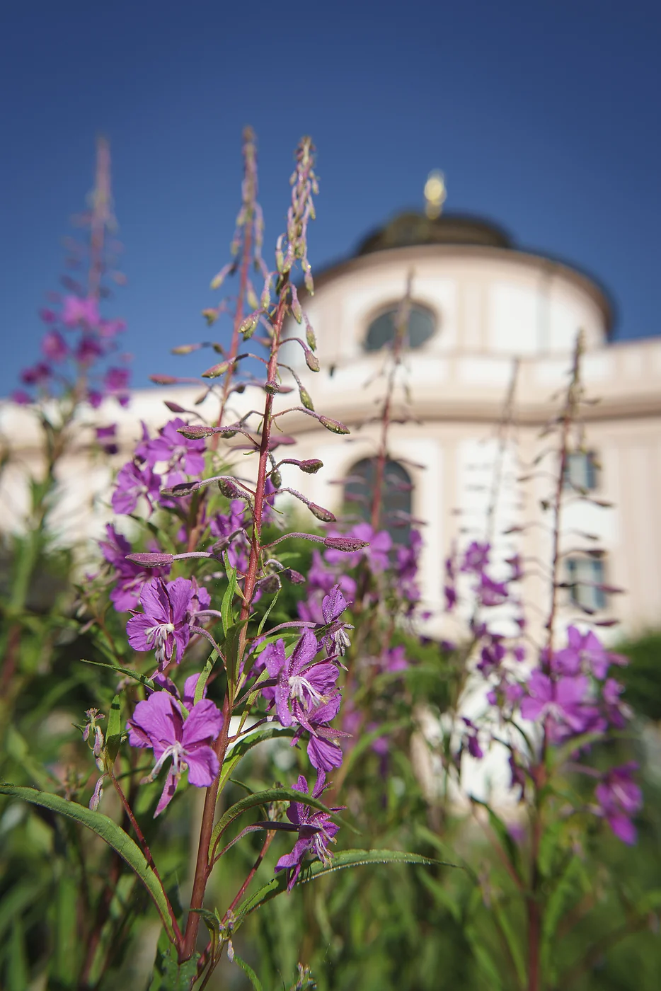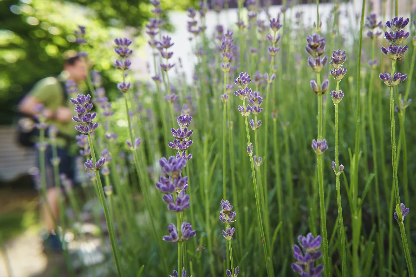 Lavendelblüten im Vordergrund, unscharfe Person im Hintergrund.Mandelblüte im Biotopgartenspanischer Garten BiotopgartenSchulklasse am Teich im BiotopgartenBiene am Anflug auf eine NachtkerzeLila Blüten im Vordergrund, verschwommenes Gebäude mit Kuppel im Hintergrund. Blauer Himmel.Die Aufnahme zeigt eine weiße Holzbank, die auf einem gepflasterten Weg steht und zu beiden Seiten von grünen Pflanzen umgeben ist. Dahinter befindet sich ein kleiner Teich mit schilfbewachsenem Ufer. Hinter diesem wiederum steht ein lachsfarbenes Gebäude. An dessen Fassade befinden sich drei große, bogenförmige Fenster. Um die Fenster zeichnen sich weiße Verzierungen ab. Ebenso sind vor den Fenstern weiße Gitter angebracht.