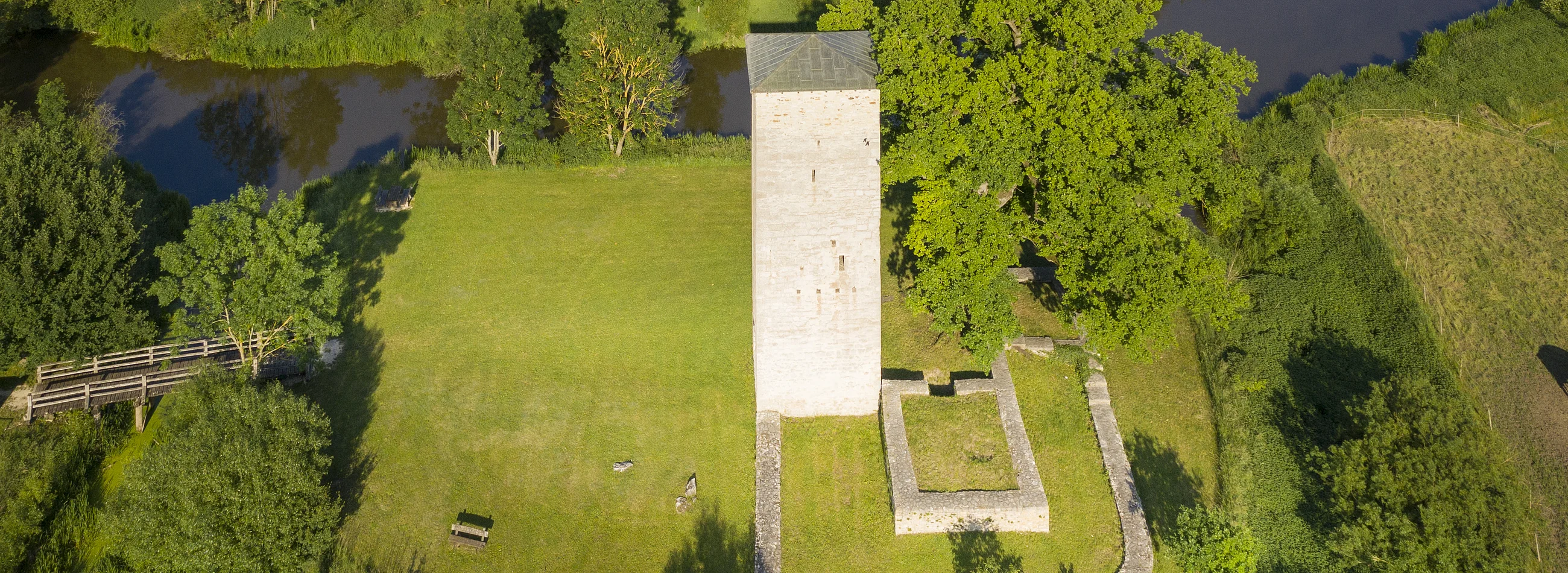 Von der einstigen Wasserburg ist noch der Bergfried mit etwa 17 bis 18 Metern Höhe erhalten. Auf einem rund sechs Meter hohen Unterbau aus glatten Kalksteinquadern erheben sich drei weitere Geschosse aus einfacherem Mauerwerk. Ein Tonnengewölbe schließt das letzte Stockwerk ab. Der Erdhügel mit der mächtigen Eiche neben dem Turm bezeichnet die Stelle des zusammengestürzten Wohnbaues. Der ehemals sieben bis acht Meter breite, dann weitgehend eingeebnete Wassergraben, wurde vor einigen Jahren wieder eingetieft. Teilweise ist der Bering noch erkennbar.