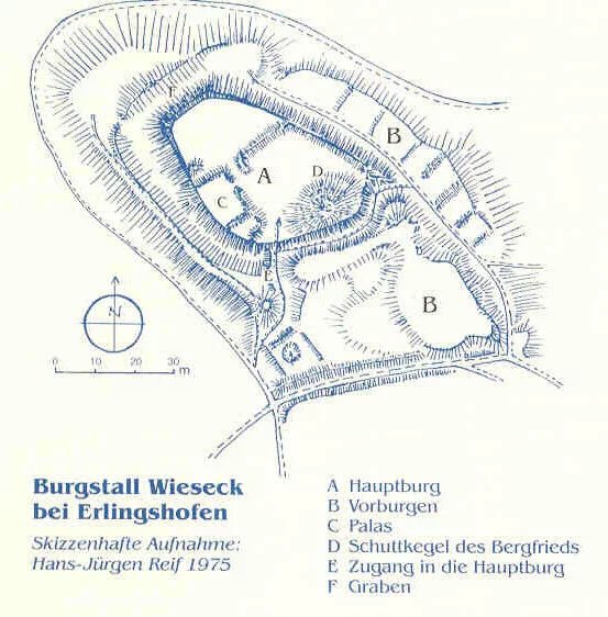 Die Burg war der Sitz der Ministerialen von Erlingshofen, die 1159 zuerst bezeugt sind. Für die im Volksmund „alte Feste“ genannte Burgstelle kam nach 1799 die romantische Bezeichnung „Wieseck“ auf.