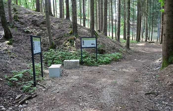 - Am Waldrand steht ein Wegweiser und über einen Forstweg gelangt man zu Fuß in ca. 10 Minuten zur Quelle.