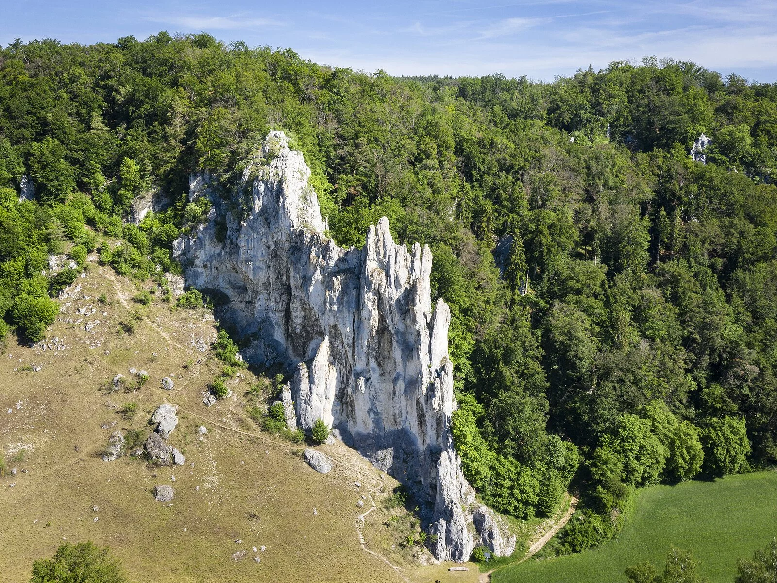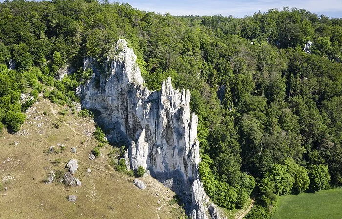 Die Felsenpartie am nördlichen von Trockenrasen bedeckten Hang des Urdonautales ragt ca. 70 m auf. Die hell leuchtenden Felsbastionen - heute ein vielbesuchtes Kletterparadies - sind vor etwa 150 Millionen Jahren, im Erdzeitalter des Weißen Jura (Malm), entstanden.