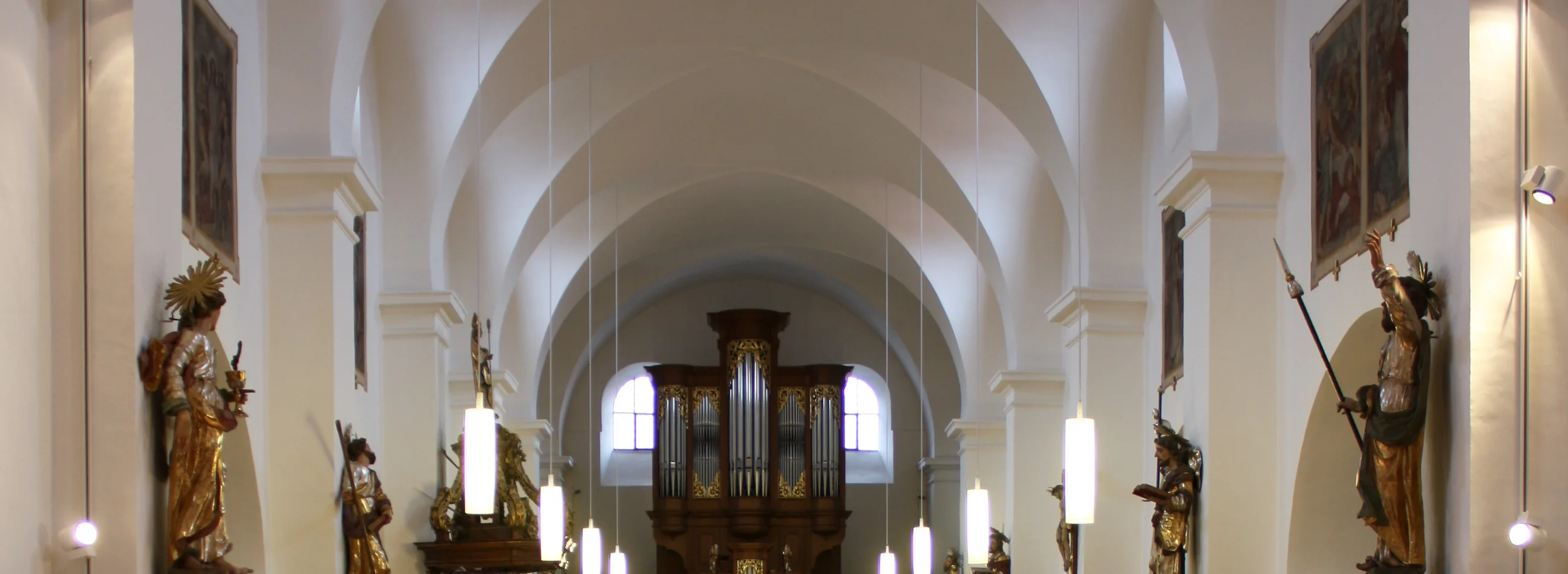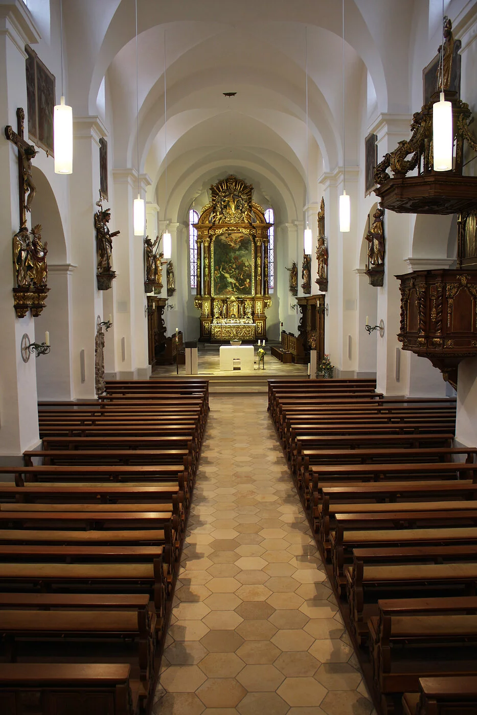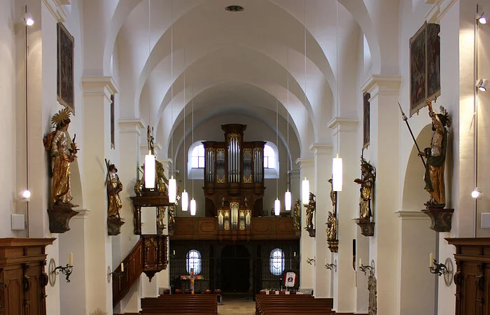 Wenn auch am Äußeren noch einige Baudetails wie Rundbogenfriese an der Traufe und in Blendfeldern des Turms auf die Bauzeit in der Romanik hinweisen, ist der Innenraum durch Engel zur Gänze hochbarock gestaltet worden, wozu auch die einheitliche Ausstattung beiträgt. Der niedrige Obergaden der dreischiffigen Basilika führt dazu, dass trotz breiter Fenster der Innenraum schwach belichtet erscheint. Breite Pfeiler mit Vorlagen tragen das Gewölbe mit querrechteckigen Jochen im Mittelschiff, das ohne Trennung durch Gurtbögen auskommt. In den Seitenschiffen sind die Joche schmal und sie verfügen über eine Trennung. Auch über die Außenwände ist der Lichteinlaß durch die Ovalfenster eingeschränkt. Im Chor läuft das Gewölbe in derselben Höhe weiter. Er ist durch die Apsis abgeschlossen.