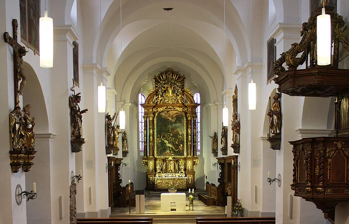 Im hohen Mittelalter war der Kirchenraum zweigeteilt in den Chor für das Stift und das Langhaus für die Pfarrei. Wohl in der ersten Hälfte des 12. Jahrhunderts wurde eine dreischiffige Basilika mit Querhaus, einschiffigem Chor und Krypta sowie zwei Westtürmen errichtet. Ab 1647 traten große Bauschäden auf, sodass man sich entschloss, das Querhaus abzutragen. Der von Engel geleitete Umbau in den Jahren 1698-1700 beinhaltete den Abbruch der Seitenschiffe und die Verfüllung der Krypta. Es war sein größtes Projekt als Sakralbau. Seine Leistung wurde von der Bauherrenschaft sehr gewürdigt.