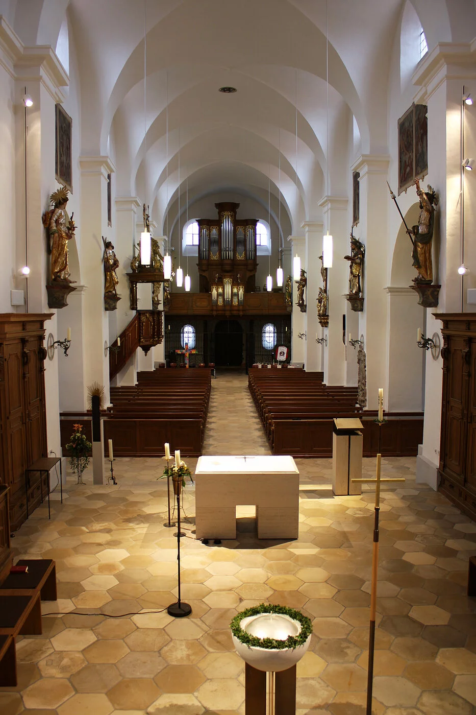 Es gibt keine Hinweise, dass der Raum über eine Stuck- und Freskoausstattung verfügt hätte. Diesen Eindruck der Nüchternheit versuchte man im Rahmen einer Restaurierung im Jahre 1939 abzuhelfen und gestaltete die Mittelschiffwände mit großformatigen Kreuzwegstationen. Das erste Chorjoch flankieren zwei Sakristeien, die äußerlich nicht abgesetzt sind. An dieser Stelle wird das frühere Querhaus vermutet. Von der Krypta hat sich nur ein Joch erhalten. Es ist von außen zugänglich. Eingespannt zwischen den Türmen liegt eine Vorhalle, auf der die Orgelempore aufgesetzt ist. Im erhaltenen Nordturm befindet unter dem Bodenniveau die Laurentiuskapelle, die mit Resten gotischer Wandmalerei ausgestattet ist. An den ehemaligen Südturm ist eine Ölbergkapelle angebaut, die spätgotische Skulpturen enthält.