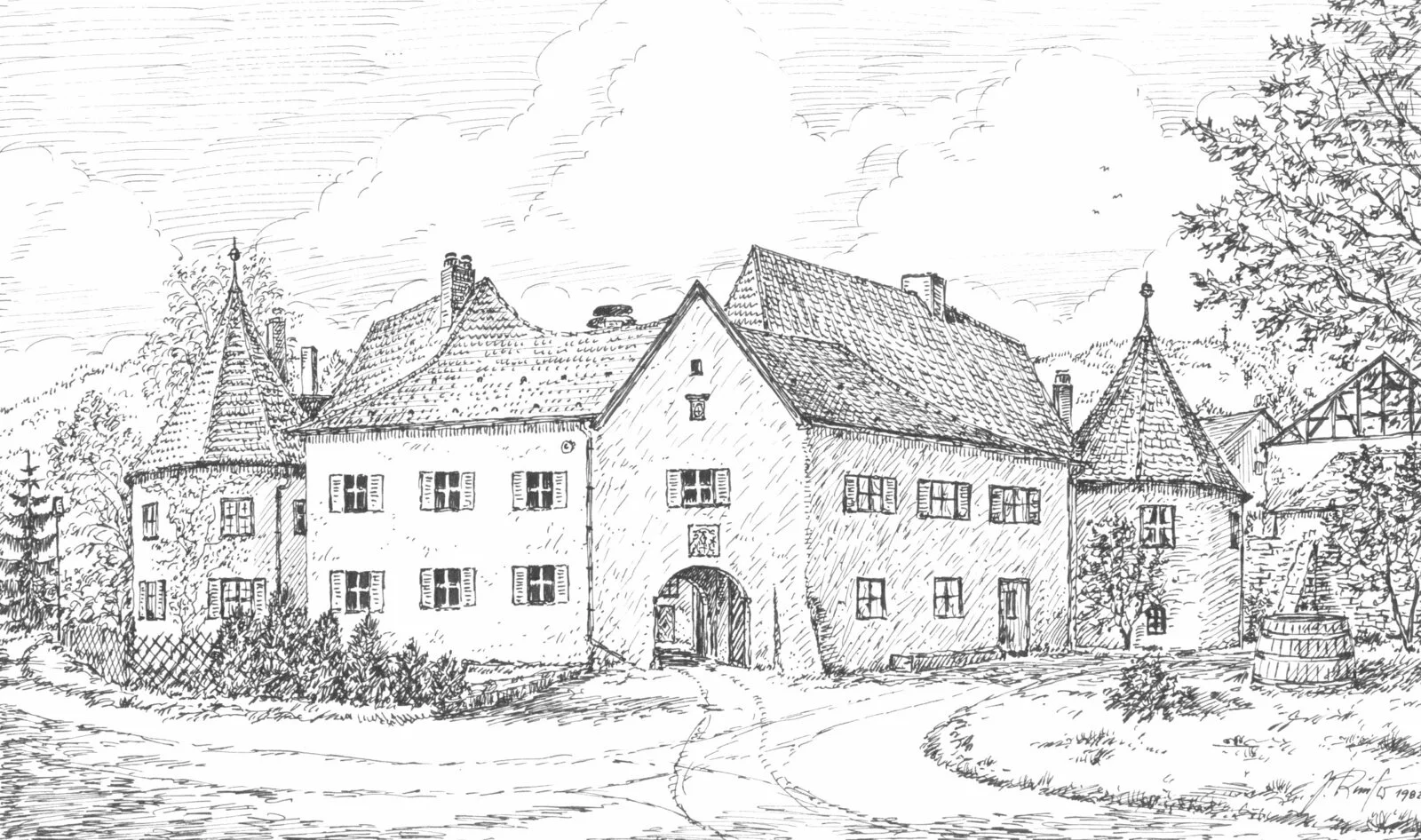 Die Anlage bildet ein unregelmäßiges Achteck; zweigeschossige Gebäudeflügel des 17./18. Jahrhunderts umschließen einen Innenhof. An der Ost- und Westseite springt je ein Rundturm aus dem 16. Jahrhundert vor. Der Torbau an der Nordfront trägt die Wappen der Fürstbischöfe Marquard II. Schenk von Castell von 1645 und Johann Anton I. Knebel von Katzenellenbogen von 1707. Südwestlich im Hof befindet sich die Brauerei mit einer in einem Gewölbe untergebrachten Malzdarre. Die einst weiherartigen Wassergräben um das Schloss sind eingefüllt.