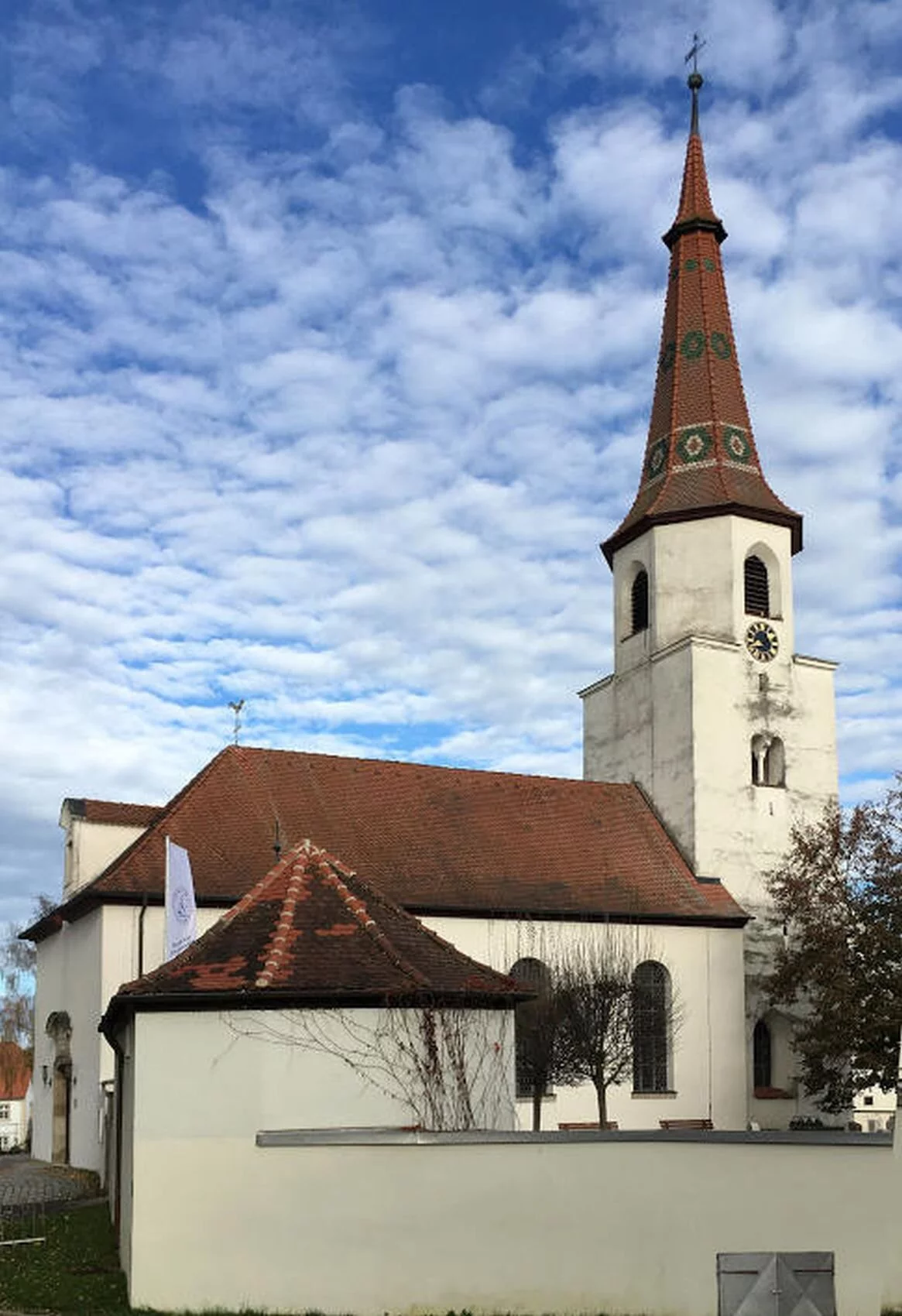 Kirche mit hohem, spitzem Kirchturm. 1958 wurden im Turmuntergeschoss große Flächen von Fresken aus der zweiten Hälfte des 14. Jahrhunderts freigelegt. Taufschüssel (16. Jh.), eine schöne Nürnberger Beckenschlägerarbeit aus Messing. Mustergültige Obstgärten ziehen sich zum Flüglinger Berg, auf dem neben Spuren vorgeschichtlicher Befestigung die besterhaltene und mächtigste turmhügelartige Burganlage in Franken liegt. Sie war der Sitz des Adelsgeschlechts der "Kropfen von Flüglingen", aus dem der Marschall Konrad Kropf von Flüglingen stammt, der 1268 mit Konradin, dem letzten Hohenstaufen, und weiteren 100 Gefährdeten entgegen dem Gerichtsurteil in Neapel hingerichtet wurde.