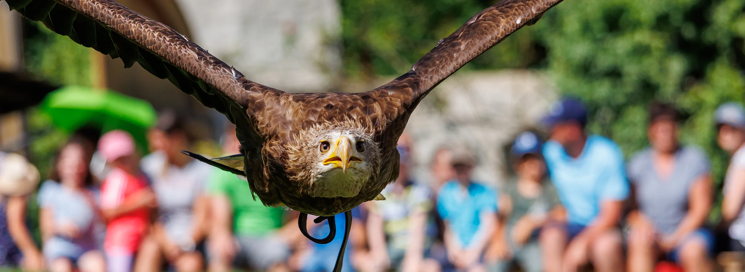 Die Artenschutz- und Forschungsstation zeigt die Könige der Lüfte in freiem Flug - ein atemberaubendes Schauspiel für Jung und Alt. Vor oder nach der Flugschau haben Sie die Möglichkeit, bei einem Rundgang über das Burggelände die Greifvögel aus nächster Nähe kennen zu lernen.