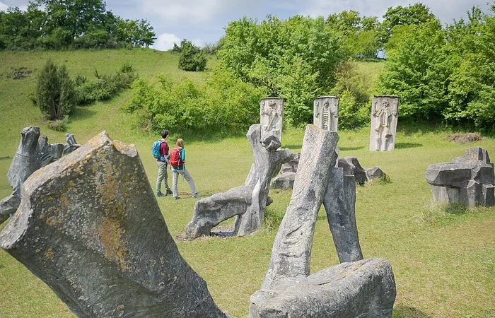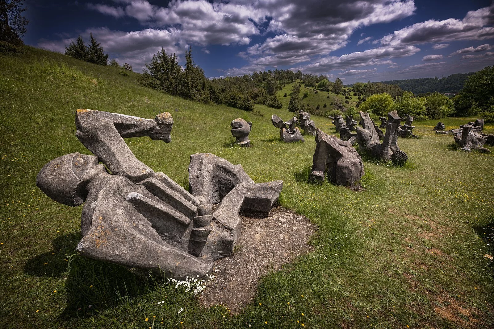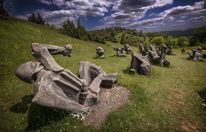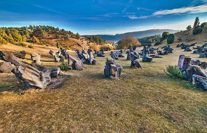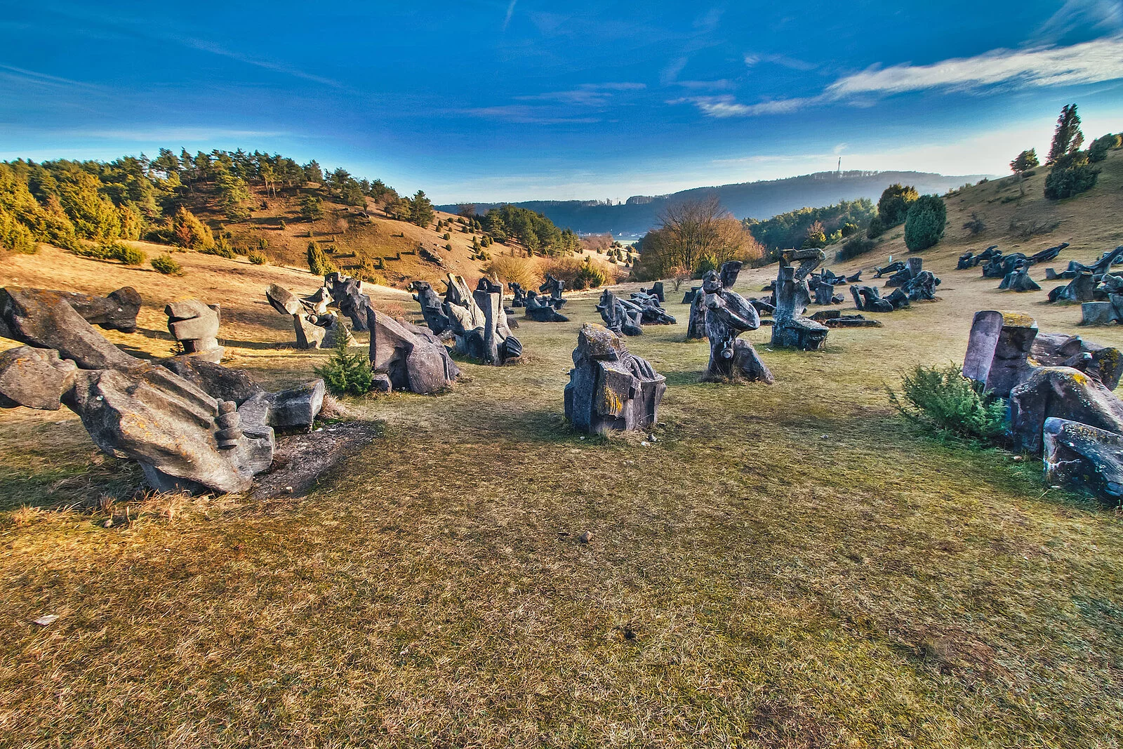 78 überlebensgroße Plastiken kauern, bäumen sich auf und kriechen auf dem Figurenfeld des Künstlers - ein eigentümlicher Gegensatz zu der kargen Juralandschaft des Hessentals. Einzelne Figuren weisen zunächst den Weg in die Mulde, wo sich die Figuren zu einem bizarr erstarrten Schlachtfeld zusammenfügen. Sie symbolisieren die Sinnlosigkeit von Krieg und Gewalt. Über 20 Jahre hat Alois Wünsche-Mitterecker an diesen Figuren aus Portlandzement, Granit- und Basaltkörnern gearbeitet. Die Vollendung des Werkes hat er selbst nicht mehr erlebt; ein Teil der Figuren wurde erst nach seinem Tode (Dezember 1975) in den Jahren 1976 - 1979 nach seinen Plänen aufgestellt.