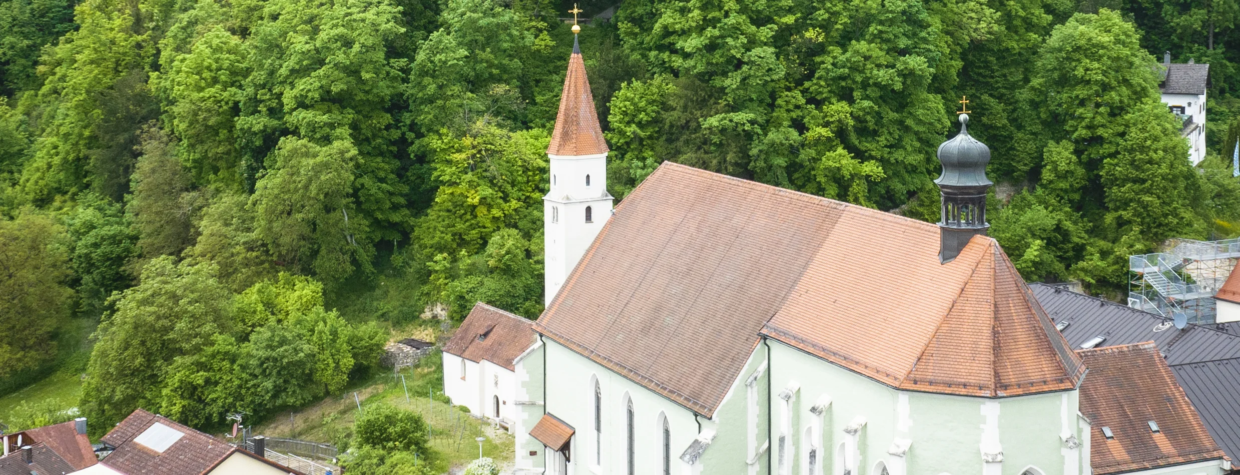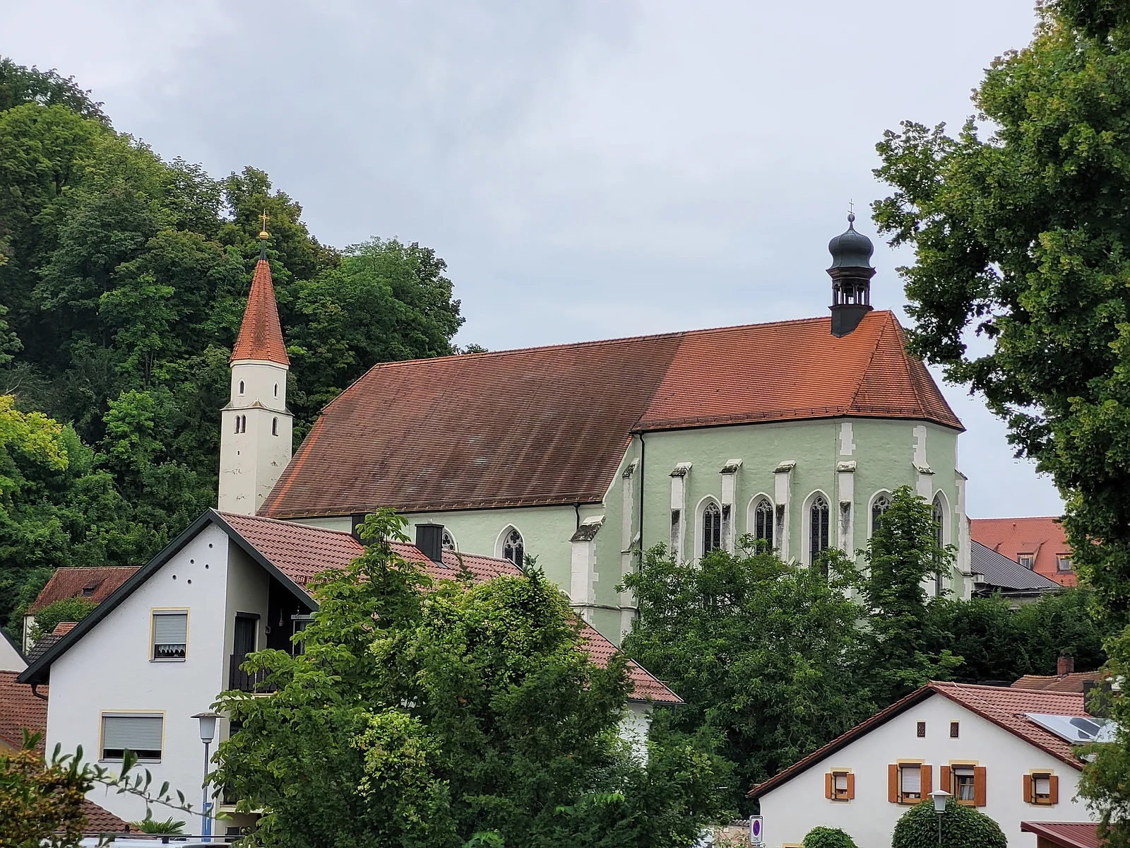 Ursprünglich als Klosterkirche der Franziskaner von 1461 bis 1471, vermutlich aus den Überresten des ehemaligen herzoglichen Meierhofes, errichtet. Durch die Säkularisation wurde das Kloster im Jahre 1803 aufgehoben, die spätgotische Kirche entweiht und die Einrichtung öffentlich versteigert. Auf einem Fresko an der Innenseite des Chorbogens –dargestellt ist das Jüngste Gericht-, das bei Renovierungsarbeiten 1953 freigelegt wurde, ist als Entstehungszeit das Jahr 1490 angegeben. In der Barockzeit wurde die Kirche umgestaltet und neu freskiert. Teile dieser Ausmalung – die Bilder der Apostel - wurden 1953 wieder freigelegt.