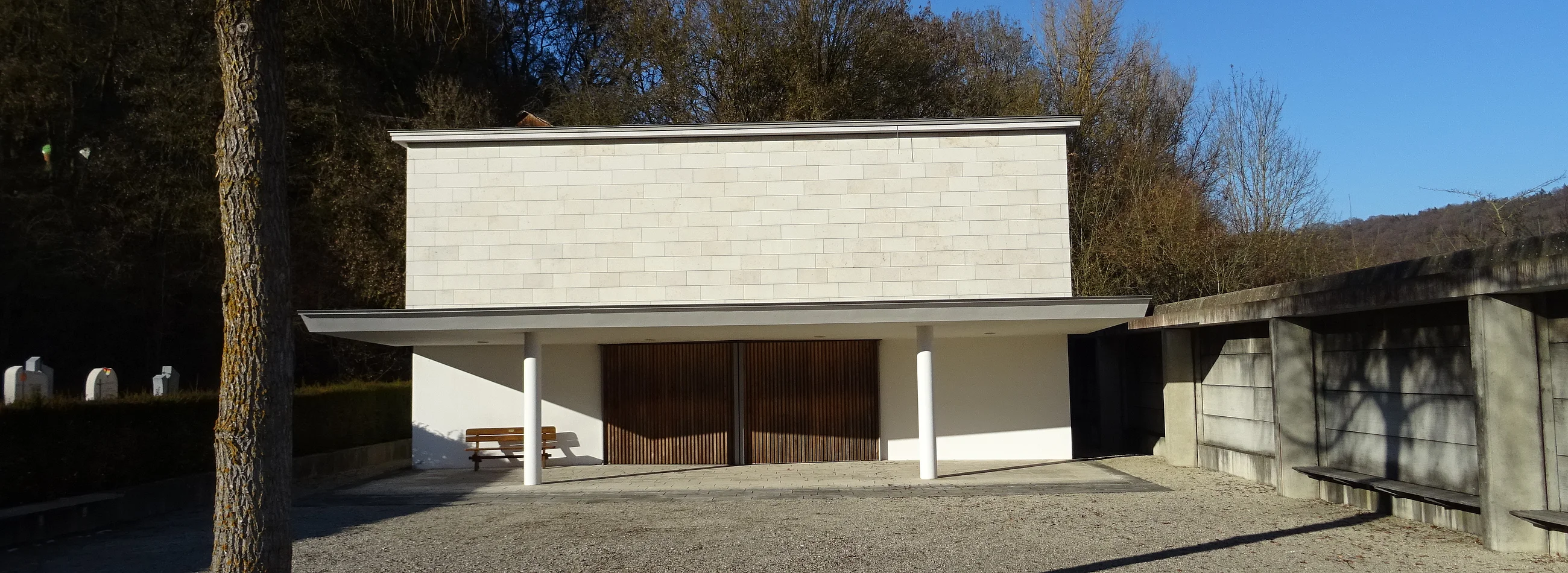 Die Terrassierung des Hanggrundstückes schafft vier Plateaus, die zusammen mit den linear angeordneten Eibenhecken die Grabfelder zonieren. Die Aussegnungshalle ist als „Endpunkt“ des Prozessionsweges aus dem Dorf (Kirche) am Ende der Mauer situiert. Die Aussegnungshalle ist ausschließlich über Oberlichte natürlich belichtet. Der helle, lichtdurchflutete Raum schafft mit Hilfe der weißen Wände und des dezenten Natursteinbelages eine sakrale Atmosphäre.Die Aussegnungshalle ist in Massivbauweise errichtet. Die Decken und Raumverfaltungen sind in Stahlbeton geformt. Auf dem Holzdachstuhl befindet sich eine Edelstahlblecheindeckung, mit innenliegender Dachentwässerung. Fassadenverkleidung und Bodenbelag der Aussegnungshalle bestehen aus Jurakalksteinplatten.
