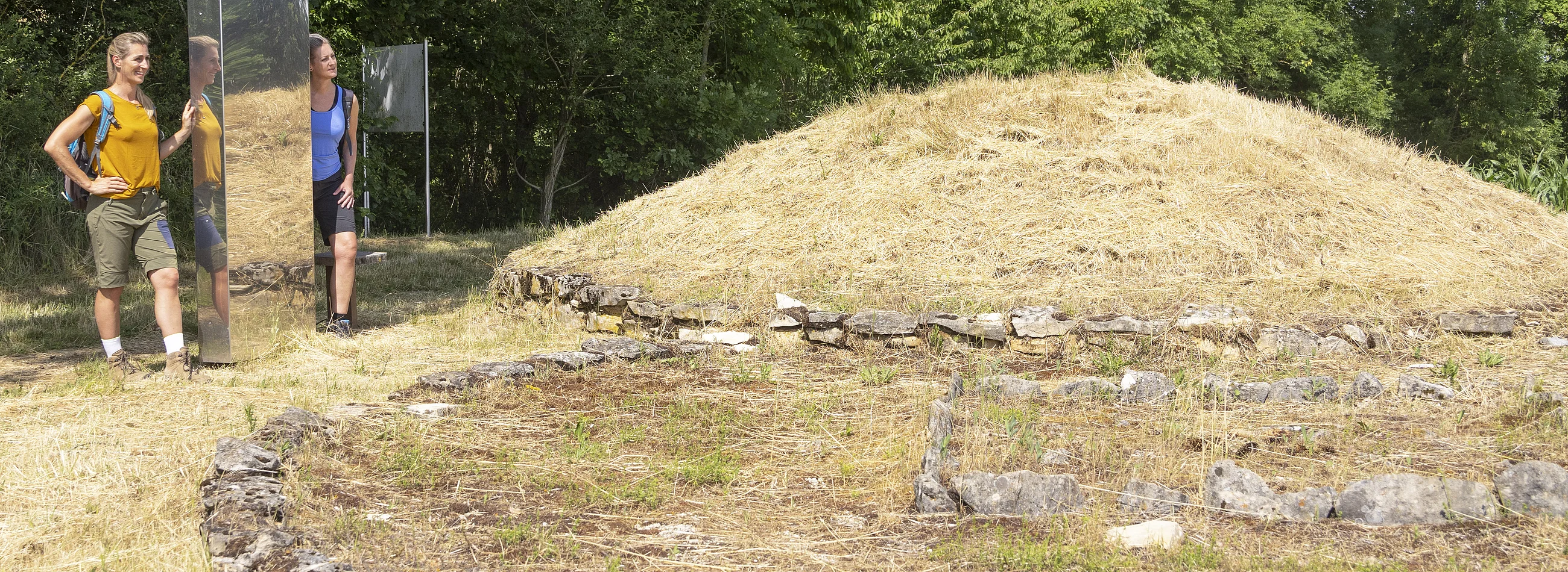 Die fünf hier wieder aufgebauten Grabhügel bildeten zur späten Hallstattzeit (zm 500 v.Chr.) das Zentrum eines größeren Grabhügelfeldes. Die Steinkreise der Grabhügel waren in unterschiedlicher Bauweise errichtet. Die Trockenmauer bestand aus flach übereinandergelegten Steinplatten, aus senkrecht in den Boden gesetzten Kalksteinen oder einer Mischung beider Bauarten.