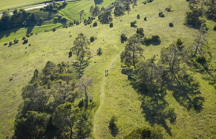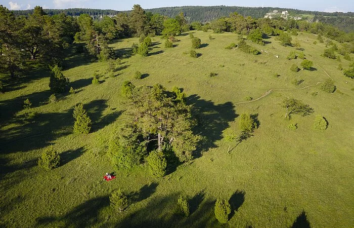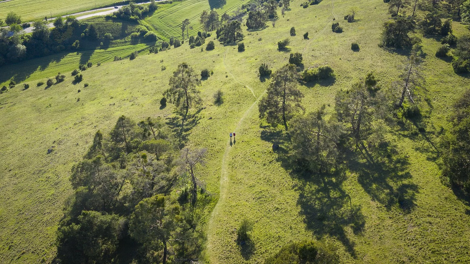 Wanderer auf der Gungoldinger Wacholderheide unterwegs auf dem Altmühltal-Panoramaweg. Die Wanderer sind nur ganz schwach inmitten der grünen Landschaft auszumachen.Gungoldinger WacholderheideWanderer auf der Gungoldinger Wacholderheide von oben. Die Wacholderheide mit ihren typischen Büschen leuchtet in hellem grün.