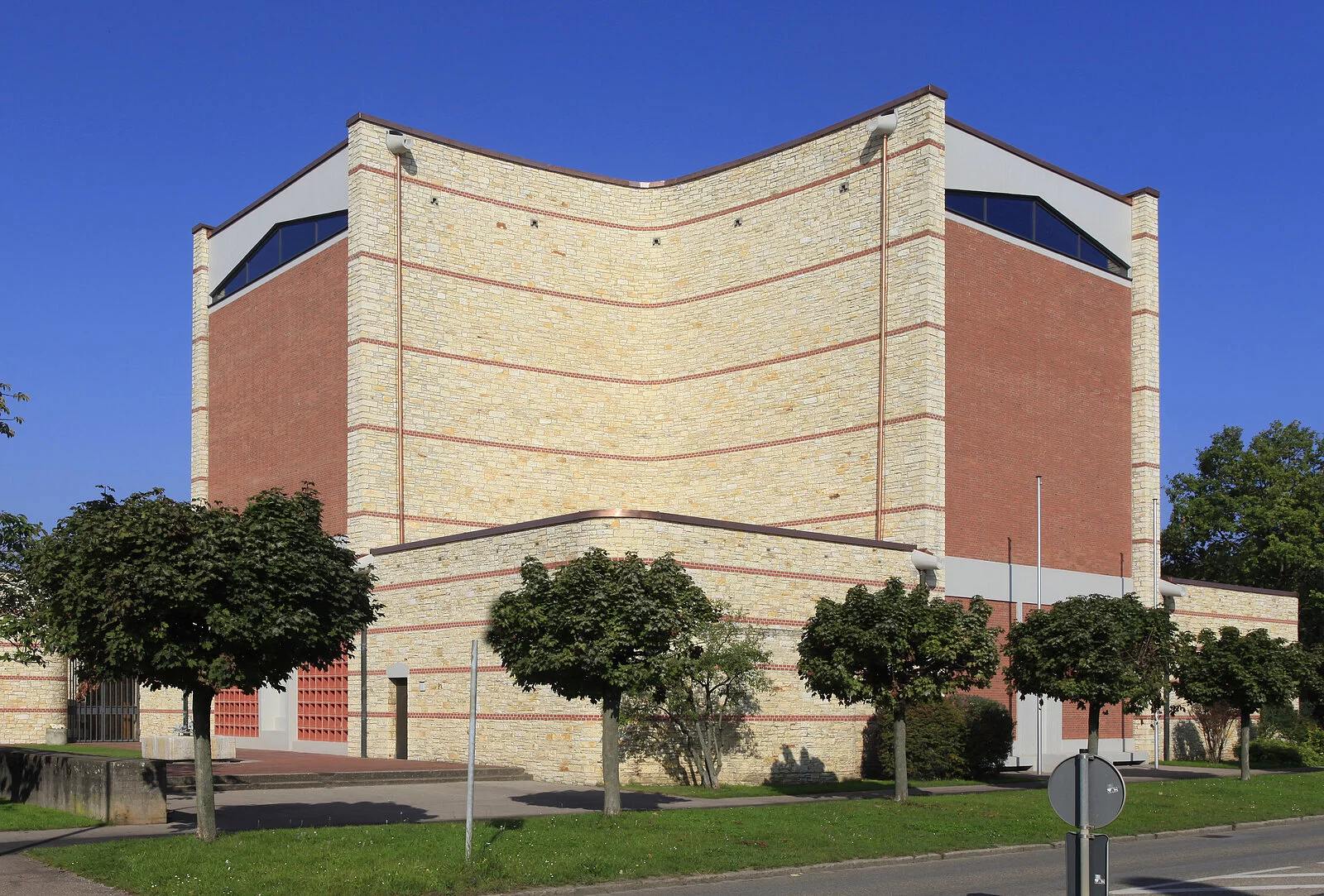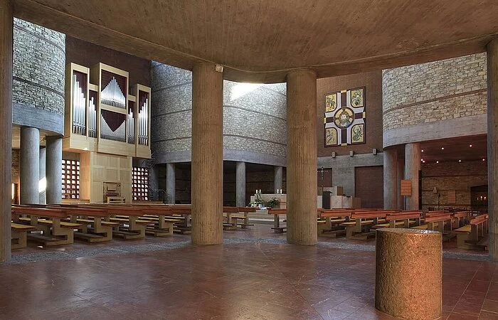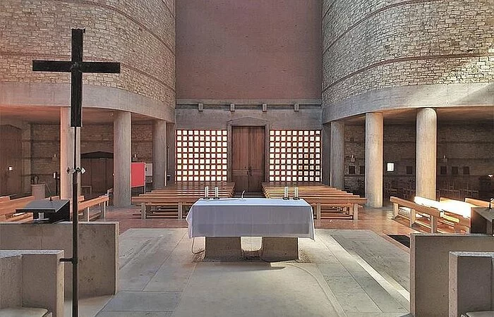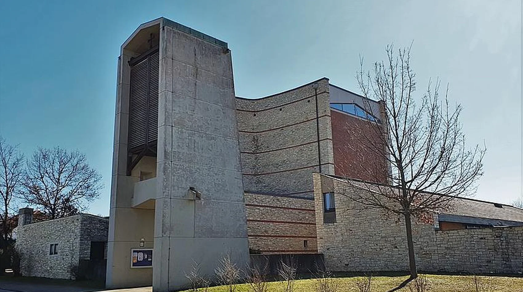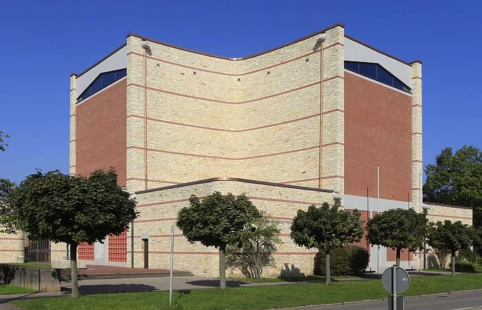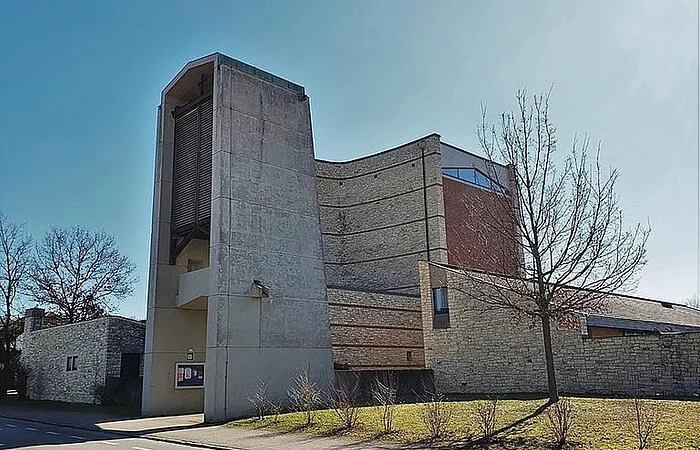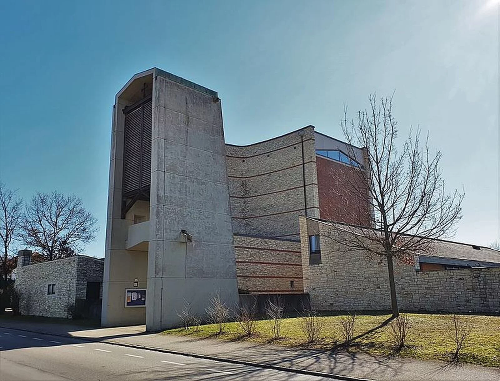 Das Gotteshaus selbst ist ein moderner über quadratischem beziehungsweise in der Hauptsache kreuzförmigem Grundriss errichteter hochaufragender Bau mit in Stahlbeton-, Bruchstein- und Klinkermauerwerk ausgeführten, außen wie innen unverputzten Außenmauern und einem das Erscheinungsbild des Sakralbaus von oben wesentlich bestimmenden Flachdach in Kreuzesform. Die vom Hauptgebäude etwas abgesetzte, mit diesem aber über einen Eingangstorbau verbundene, in Bauweise und Material dem Hauptbau entsprechende Taufkapelle im Südwesten sowie der freistehende, sich nordwestlich der Kirche gleichsam als Tor über dem Zugang zum Kirchenbezirk erhebende gedrungene Glockenturm aus Stahlbeton beeinflussen das äußere Gesamterscheinungsbild der Kirche wesentlich mit, ebenso der auf deren Nordseite angefügter dreiflügeliger, zu ihr hin einen Innenhof bildender Sakristeianbau.