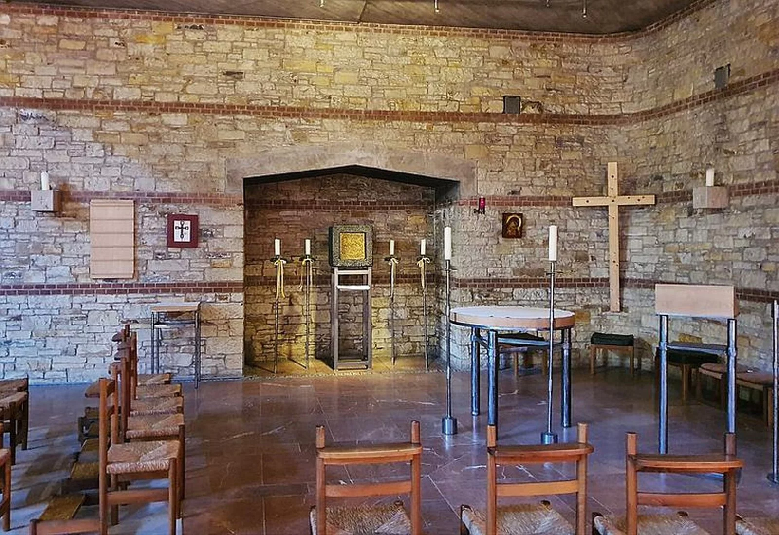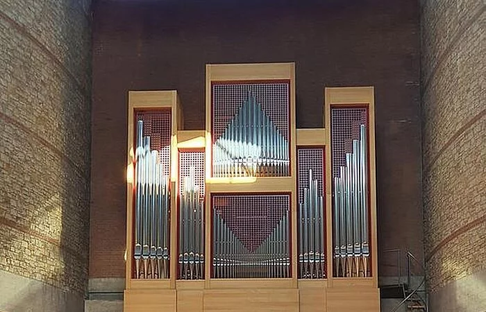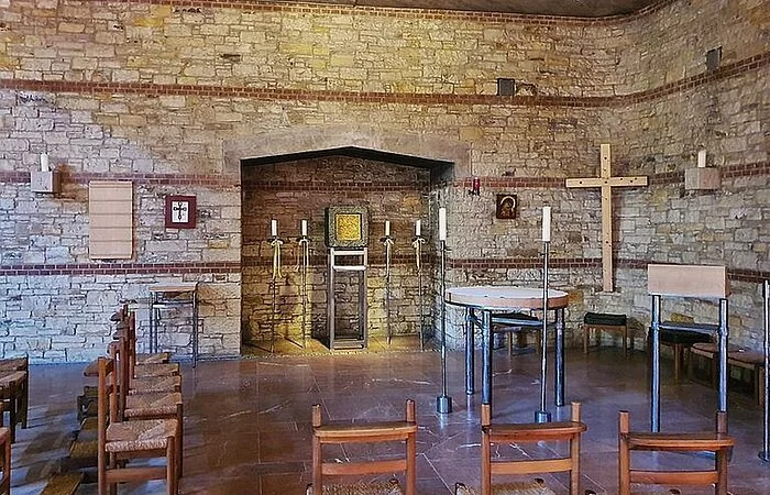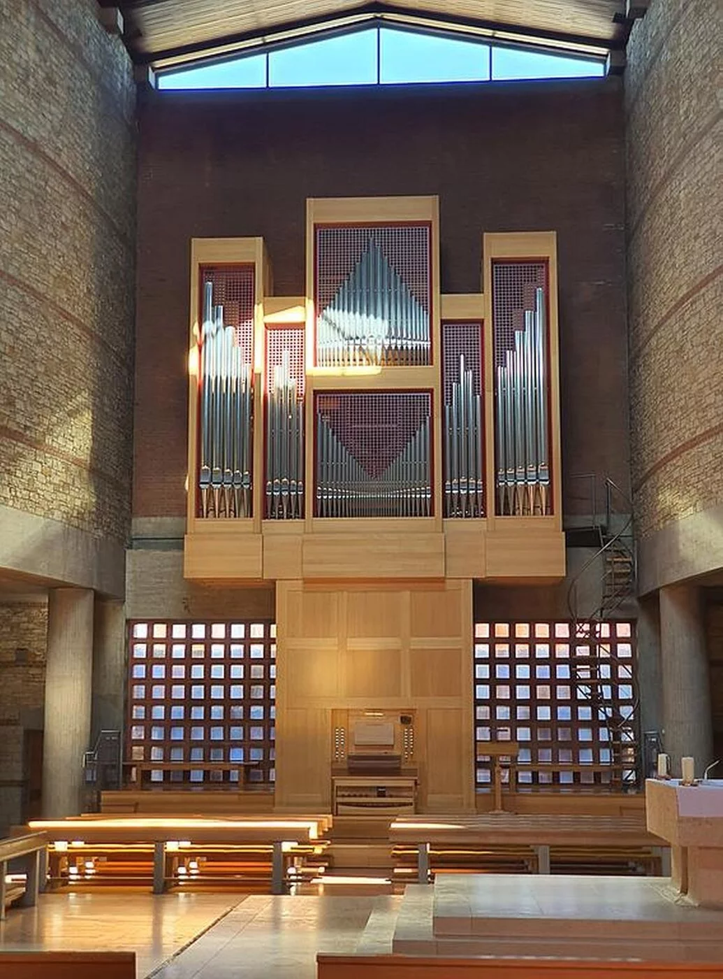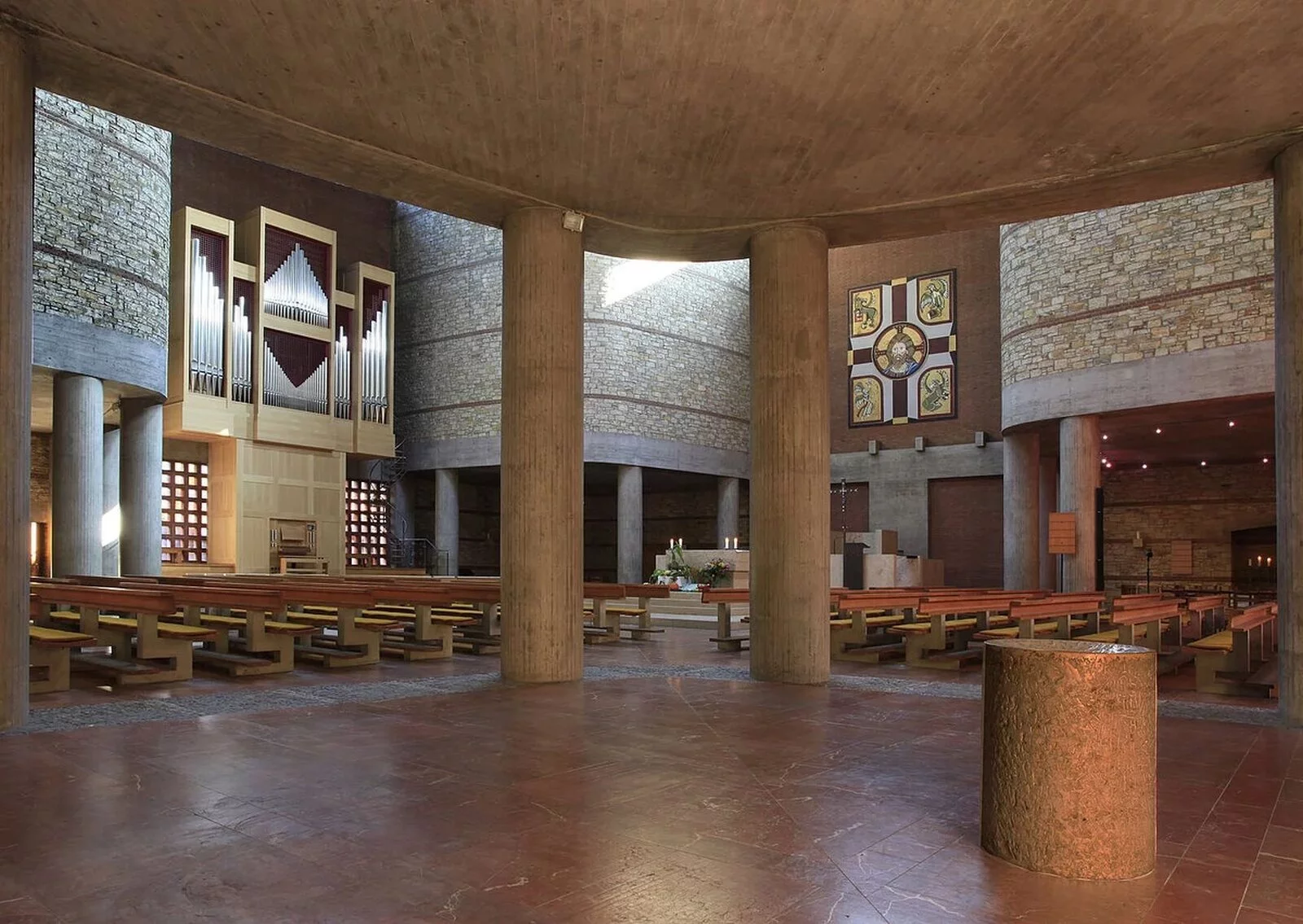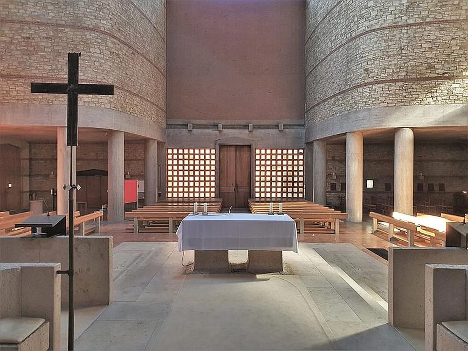 Das Gotteshaus selbst ist ein moderner über quadratischem beziehungsweise in der Hauptsache kreuzförmigem Grundriss errichteter hochaufragender Bau mit in Stahlbeton-, Bruchstein- und Klinkermauerwerk ausgeführten, außen wie innen unverputzten Außenmauern und einem das Erscheinungsbild des Sakralbaus von oben wesentlich bestimmenden Flachdach in Kreuzesform. Die vom Hauptgebäude etwas abgesetzte, mit diesem aber über einen Eingangstorbau verbundene, in Bauweise und Material dem Hauptbau entsprechende Taufkapelle im Südwesten sowie der freistehende, sich nordwestlich der Kirche gleichsam als Tor über dem Zugang zum Kirchenbezirk erhebende gedrungene Glockenturm aus Stahlbeton beeinflussen das äußere Gesamterscheinungsbild der Kirche wesentlich mit, ebenso der auf deren Nordseite angefügter dreiflügeliger, zu ihr hin einen Innenhof bildender Sakristeianbau.