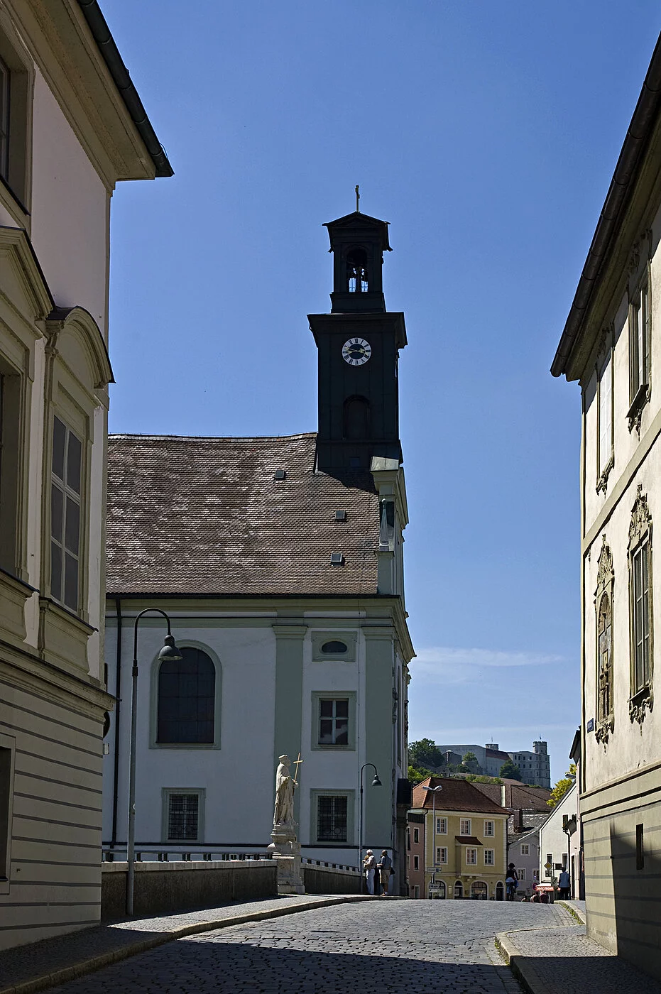 Die Kirche ist ein rechteckiger Bau, in den durch Einbauten ein kreuzförmiger zentralisierender Raum einbeschrieben ist, dessen Chor über ein zusätzliches Joch verfügt. Toskanische Pilaster, die im Tonnengewölbe von Gurtbögen fortgesetzt werden, gliedern den strengen Raum. Im Chor befinden sich Umgänge mit Oratorien, so dass auch die Kranken am Gottesdienst teilnehmen konnten. Die Altäre und die Kanzel wurden wahrscheinlich von Engel entworfen. An der Ausführung waren beteiligt die Bildhauerfamilie Handschuher und die Maler Oswald Onghers und Johann Melchior Schmidtner.