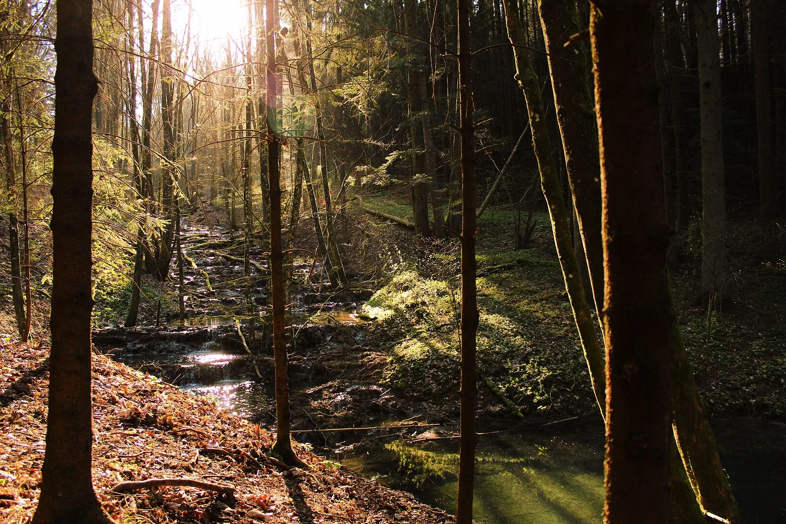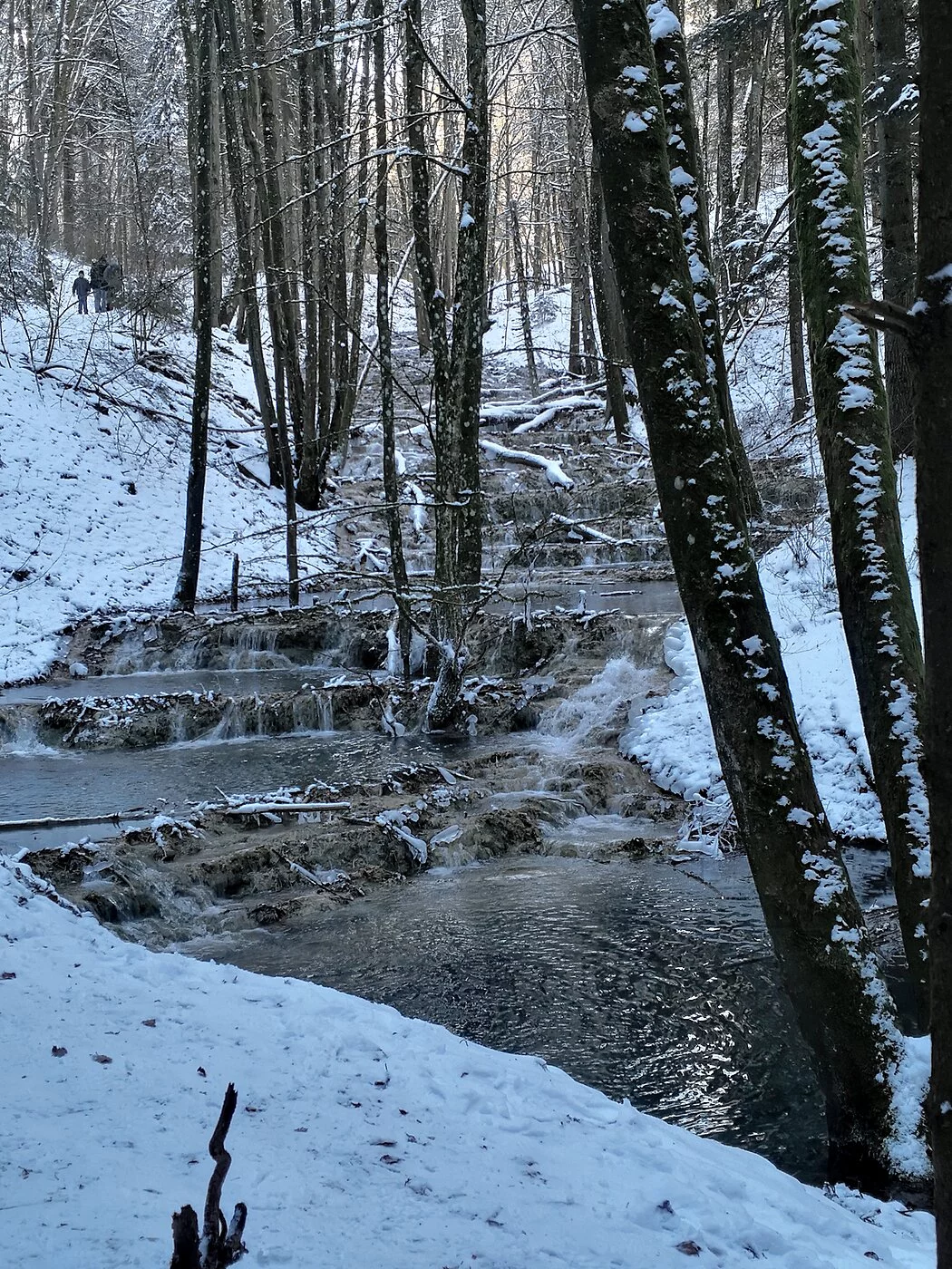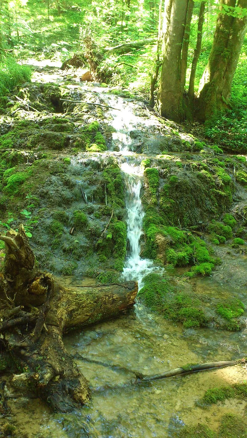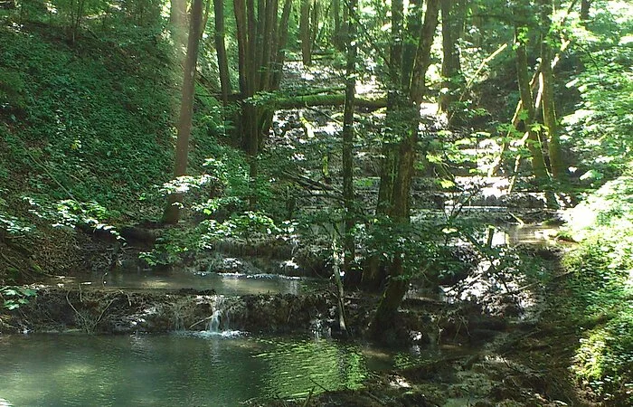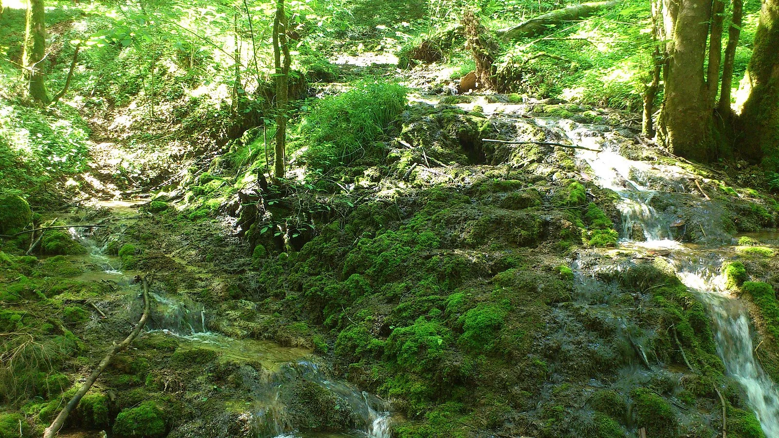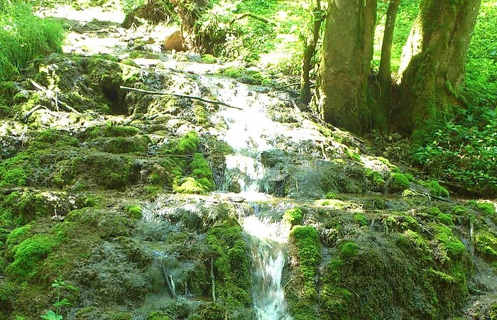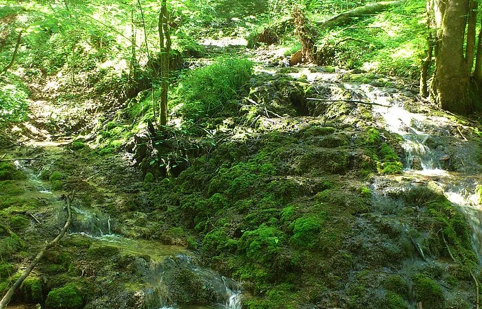 Die Terrassen entstehen durch den hohen Kalkgehalt des Quellwassers aus dem nach Erreichen der Oberfläche der Kalk ausfällt und in Form von Sinterbildungen abgelagert wird. Sinter wächst nur wenige mm/Jahr. "Baustein" von Kalkquellen ist das Starknervmoos. Es bildet ganze Teppiche aus, die, wenn sich der Kalk darauf ablagert, das Tuffgerüst bildet. Kalktuffbäche mit ihren Moosgesellschaften gehören durch ihre Seltenheit und Einzigartigkeit zu den schützenwertesten, aber auch empfindlichsten Gebilden, die durch unvorsichtige Schritte schnell zerstört werden können. (aus: Gemeinden Stadt Berching, Markt Breitenbrunn, Gemeinde Deining, Stadt Dietfurt (Hrsg.): Im Land der tausend Quellen. Wasser- und Mühlenweg im Tal der Weißen Laaber)