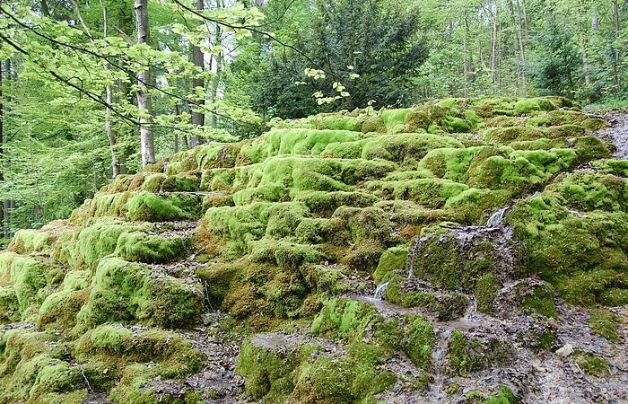 Das kalkreiche Wasser fließt hier über eine Geländestufe und hat über die Zeit zahlreiche Sinterterrassen gebildet. Die Entstehung ist ähnlich wie bei den Steinernen Rinnen. Das Niederschlagswasser der Alb-Hochfläche versickert und nimmt dabei viele Mineralien auf. Anschließend tritt es an einer Tonschicht wieder an zwei Quellen aus, die sich kurz vor den Terrassen zu einem kleinen Bach vereinen. Das Wasser hat hierbei eine Temperatur von etwa 8 Grad und erwärmt sich nur langsam. Dadurch wird Kohlendioxid an die Luft abgegeben und ein Teil des Wassers verdunstet. Begünstigt durch einen Moosbewuchs fällt Kalk aus und formt dabei die Sinterterrassen.