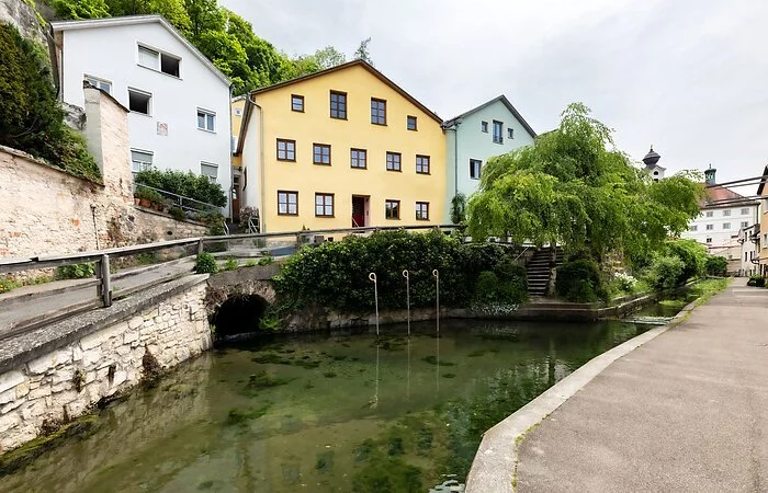 Die Quellschüttung beträgt 150 bis 250 Liter in der Sekunde. Die Häuserzeile längs des Baches - die linke schmiegt sich oben an den Felsenhang, die rechte säumt tief darunter den Bachlauf, bilden zusammen mit dem Bach ein reizendes Idyll. Der Kapellenbach ist mit Kalksteinmauern eingefasst, an denen Zymbelkraut, ein wärmeliebender Besiedler von Mauerspalten, wächst. Nach ca. 350 m fließt der Bach in die Altmühl, etwa 50 m vor der Mündung (vom Ritter-von-Hofer-Weg einsehbar) vereinigt sich der Kapellenbach mit dem Bett seines geheimnisvollen Bruders , des Edelbachs. Dieser stürzt - allerdings meist nur bei der Schneeschmelze oder bei lang dauernden Regenperioden - im Hof des Klosters St. Walburg in einem acht Meter hohen Wasserfall aus einem Felsen. Seine Wassermassen strömen im Berginnern aus Seitenspalten in einen Hauptgang, in dem sich im Laufe der Jahrtausende große Tropfsteine gebildet haben. Der Sage nach soll der Edelbach einst sein Tor sprengen und mit einer Wucht herausströmen, die Kloster und Stadt vernichten würde. Der Bach trieb mehrere Mühlen. Das 1496 erbaute Gebäude der Walburgismühle (Westenstraße 52) ist noch erhalten. Die Mühle wurde bis 1959 betrieben. Ein Mühlrad ist noch von der Westenstraße aus zu sehen und dient heute der Stromgewinnung.