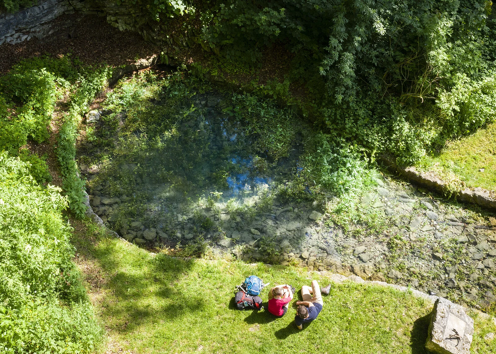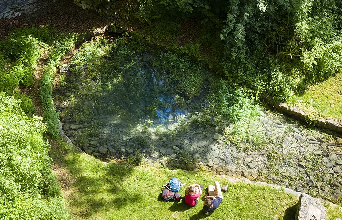 Die Karstquelle sprudelt am Fuße eines Felsens aus dem Berghang und treibt ein Mühlrad an. Die Quelle, die eine mittlere Schüttung von 140 l pro Sekunde hat, steht über das Karstgrundwasser mit verschiedenen Dolinen in Verbindung. Besonders interessant war ein Markierungsversuch, der 1958 durchgeführt wurde; dabei brachte man in eine Doline bei Denkendorf, also ca. 4,5 km entfernt auf der Jurahochfläche, Salz ein. Bereits einige Stunden danach konnten die Spuren des Salzes im Wasser des Grünen Topfes festgestellt werden. Dieser Versuch zeigt die großen Auswirkungen einer einzigen Wasserverunreinigung im Jurakarst.