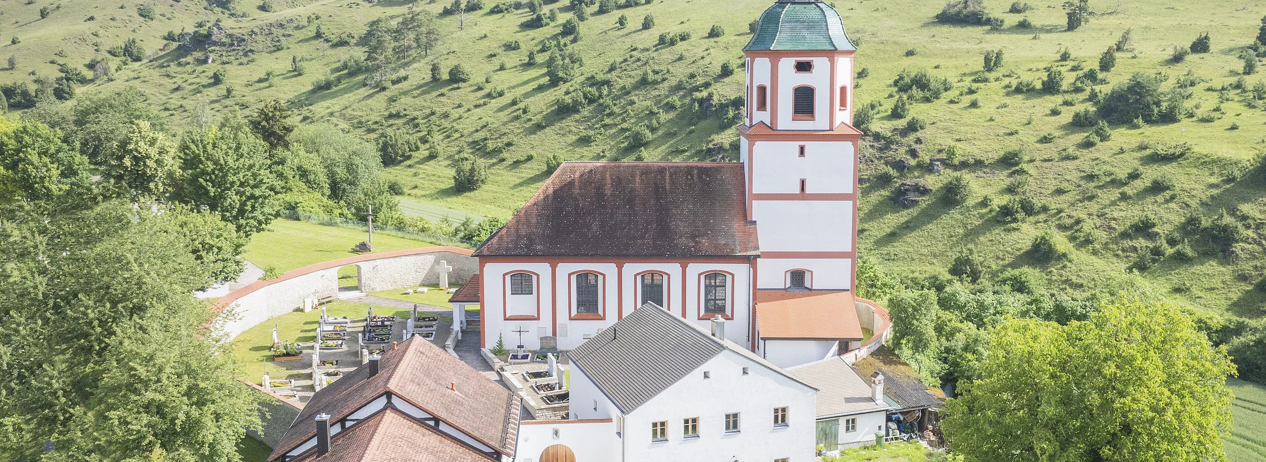 Den lichten Innenraum schmückten 1740/41 Eichstätter Künstler: Den Bandwerkstuck der Decke und die Kanzel schuf Franz Xaver Horneis, die Gemälde an der Decke des Langhauses (Aufnahme Mariens in den Himmel) und des Chores (Mariä Krönung) sowie an der Emporenbrüstung Joseph Dietrich. Auch den Hochaltar führten 1742 Eichstätter Meister aus, allerdings kamen spätgotische Skulpturen wieder zur Aufstellung: in der Mitte eine Marienfigur (um 1470) und über den seitlichen Durchgängen St. Barbara (rechts) und St. Katharina (links); beide Seitenfiguren gehörten zusammen mit der St. Margareta (an der rechten Langhauswand hinten) zu einem spätgotischen Schreinaltar (um 1500). Aus dieser Zeit stammt auch eine Holzfigur des Christus Salvator (in der Mitte der rechten Langhauswand).