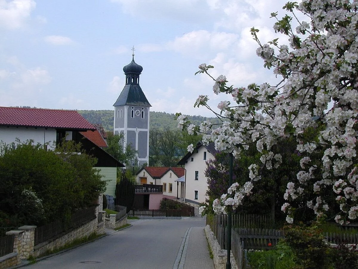 Das Gotteshaus, bis 1469 Pfarrkirche, ist in den Untergeschossen des Turms mittelalterlichen Ursprungs. Das Langhaus und den barocken Turmabschluß errichtete 1707/10 der Eichstätter Hofbaumeister Jakob Engel. Die Wieskapelle wurde 1720/30 an die Südseite des Langhauses angebaut.