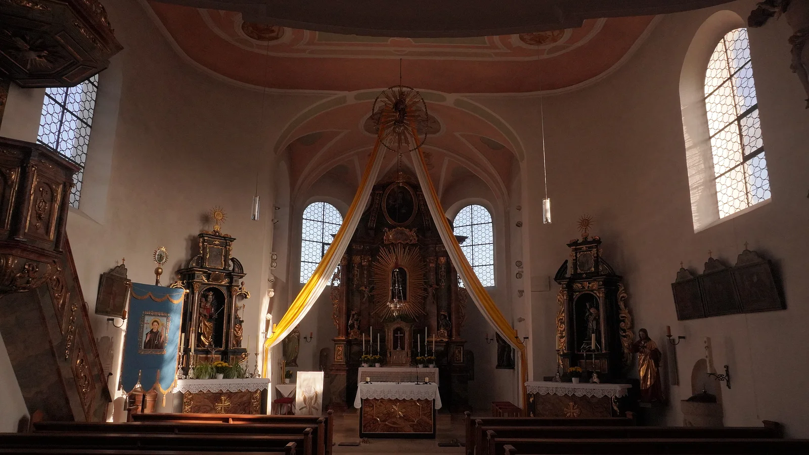 Die besten Holzschnitzwerke des Gotteshauses sind am linken Seitenaltar (um 1670 bis 1680) zusammengefasst: Die hl. Maria mit Jesuskind in der Mitte, rechts der hl. Nikolaus und links wohl der hl. Benedikt; alle Figuren sind spätgotische Schöpfungen um 1510, die Seitenfiguren von beachtlicher Qualität. Aus der Barockzeit stammen die Kanzel (um 1680) und die Rosenkranzmadonna am Chorbogen (um 1670). Den ansprechenden Kreuzweg im Querformat malte 1767 Anton Köll aus Kipfenberg.