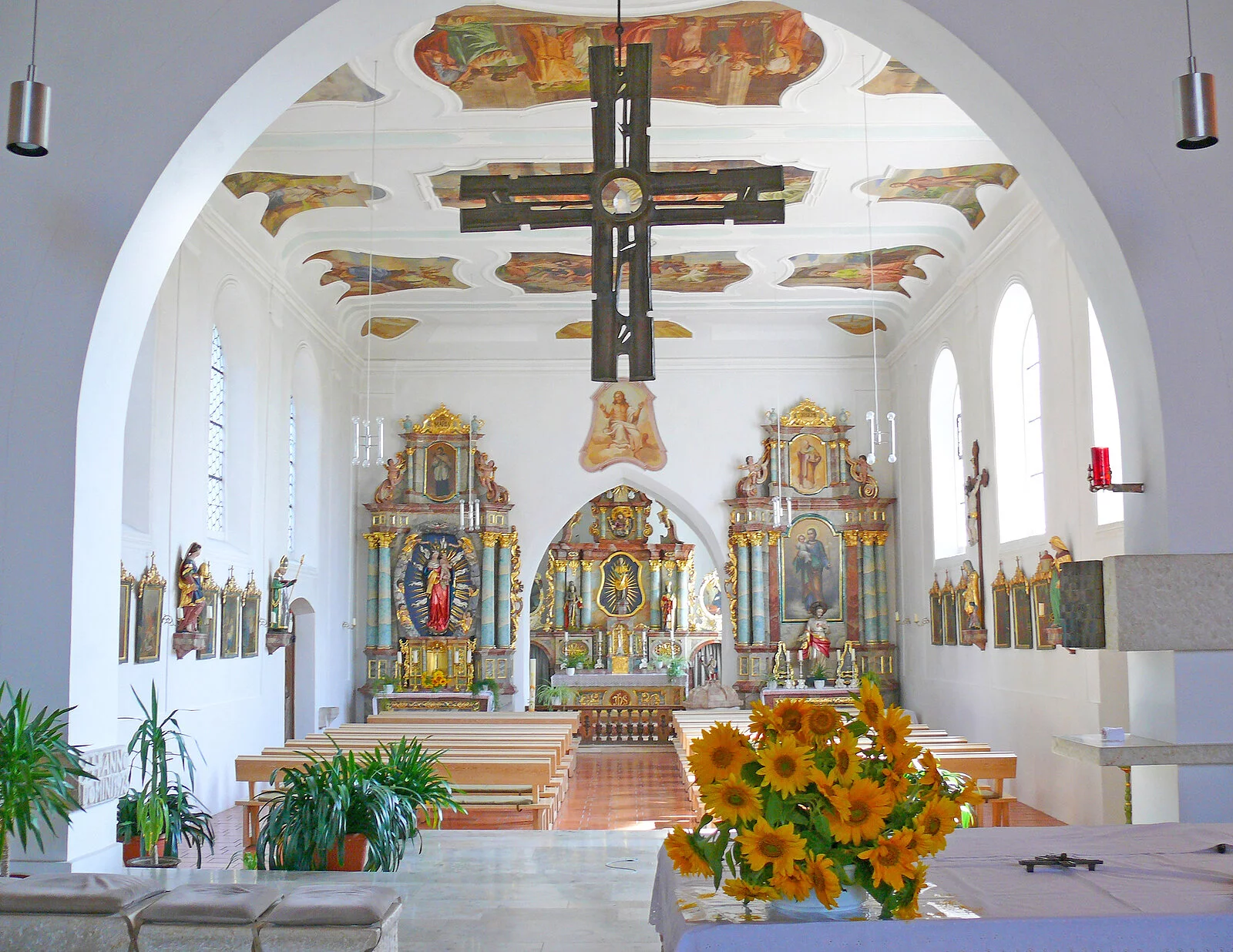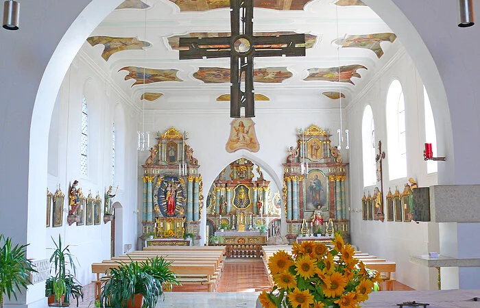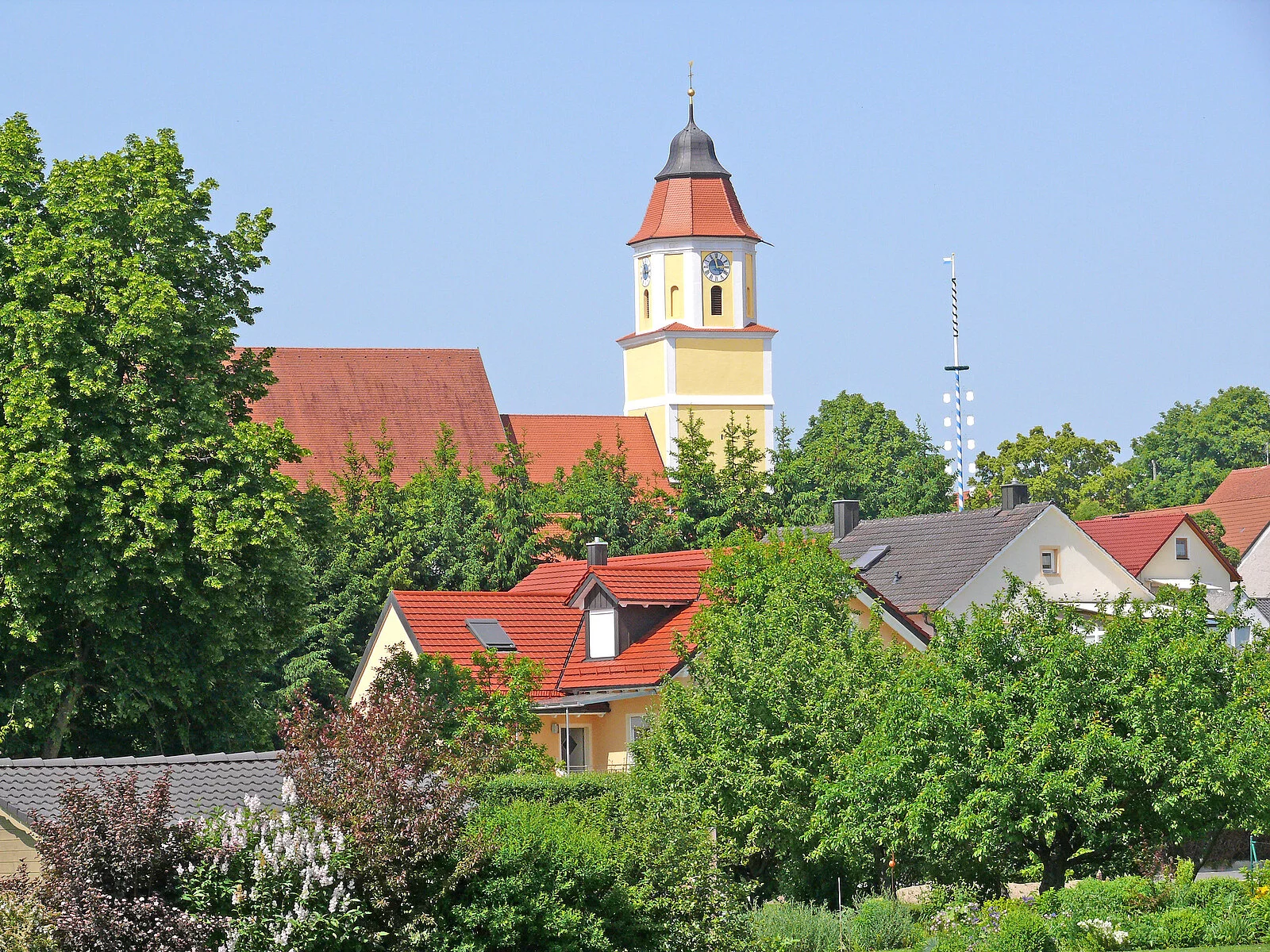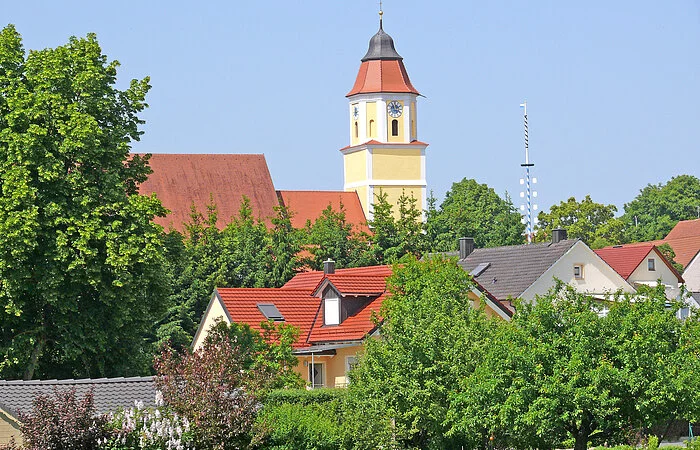 Ältester Teil des Gotteshauses sind die gotischen unteren Partien des Turmes mit dem Chor. Unter Einbeziehung dieser Bauteile wurde 1701/02 ein neuer Turm errichtet. Architekt und Baumeister des 1740 erbauten barocken Langhauses war der Ingolstädter Stadtmaurermeister Michael Anton Prunthaller. Den heutigen charakteristischen Turmabschluß schuf der Kameralmaurermeister Joseph Deiglmayer 1798, nachdem ein Blitz die Kuppel zerstört hatte.