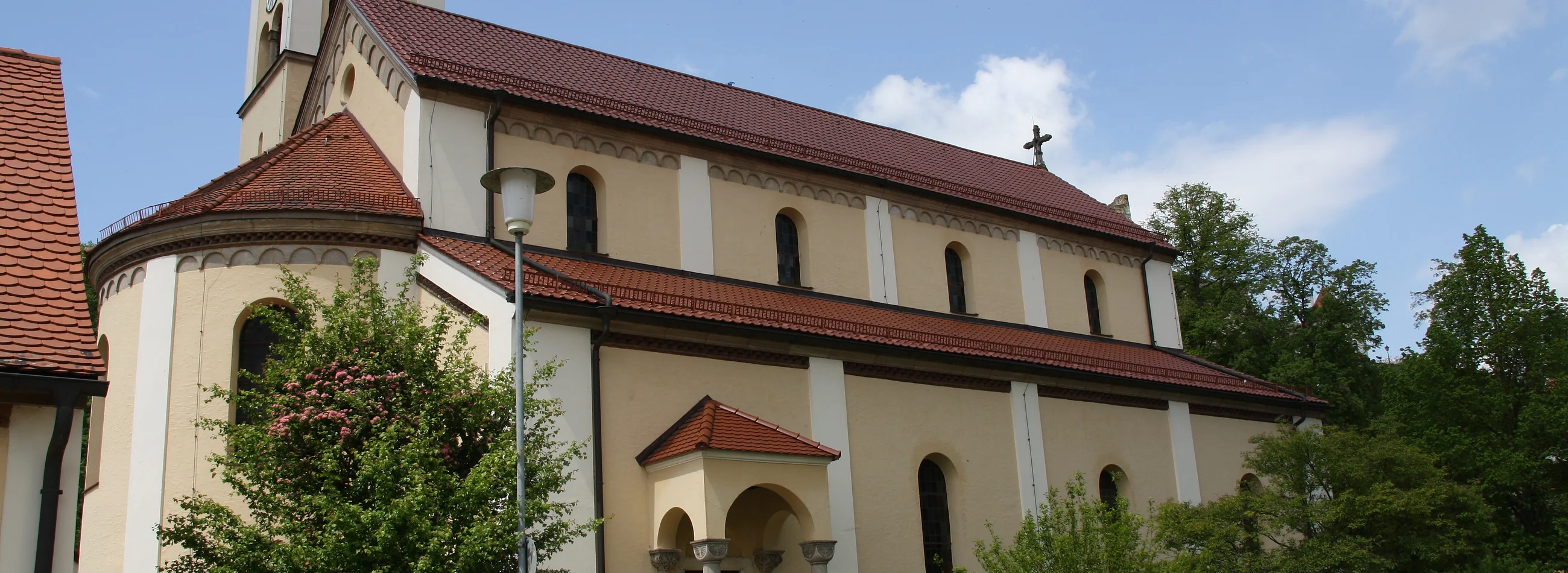 Der Bau steht in der Tradition der dreischiffigen Pfeilerbasilika des süddeutschen Raumes ab dem 12. Jahrhundert; entsprechend wird die westliche Giebelseite durch ein großes Radfenster sowie ein romanisches Gewändeportal mit Tympanon akzentuiert. Bei den Längsfronten alternieren Lisenen mit kleinen Rundbogenfenster, als Abschluss unterhalb der Traufe dient ein schmuckvolles Rundbogenfries.Der ebenfalls auf mittelalterliche Vorbilder zurückgreifende viergeschossige Campanile mit bekrönendem Pyramidendach zeigt im Schallgeschoß romanische Zwillingsfenster. Im Inneren wird man unwillkürlich an die erhabene Sakralbaukunst einer längst vergessenen Epoche erinnert. Die kleinen Fenster, deren Verglasung leider verändert wurden, beleuchten einen Innenraum, dessen Hochaltarretabel aus dem Dom von Eichstätt stammt. Die 1988/99 wieder freigelegte Ausmalung im Nazarenerstil ist ebenso wie die originale Ausstattung ein Werk des Künstlers Johannes Lang.