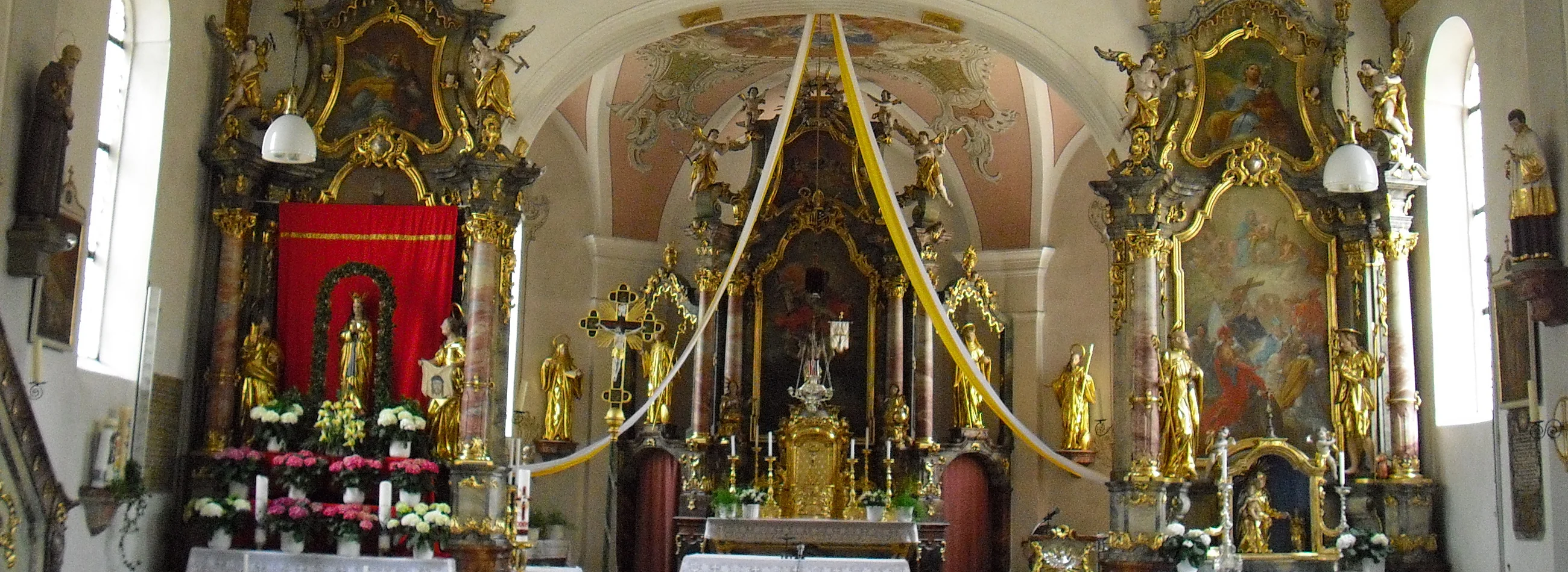 Die Turmuntergeschoße (1623 – 1625) und der heutige Bau (1753) wurden im Auftrag des Klosters Heilig-Kreuz in Donauwörth errichtet. Das Innere zeigt eine Ausstattung im Rokokostil um 1750/60. Das Deckenbild im Chor stammt von Johann Benedikt Reißmüller (1752), Altäre und Kreuzweg (1786) von Johann Baptist Enderle.